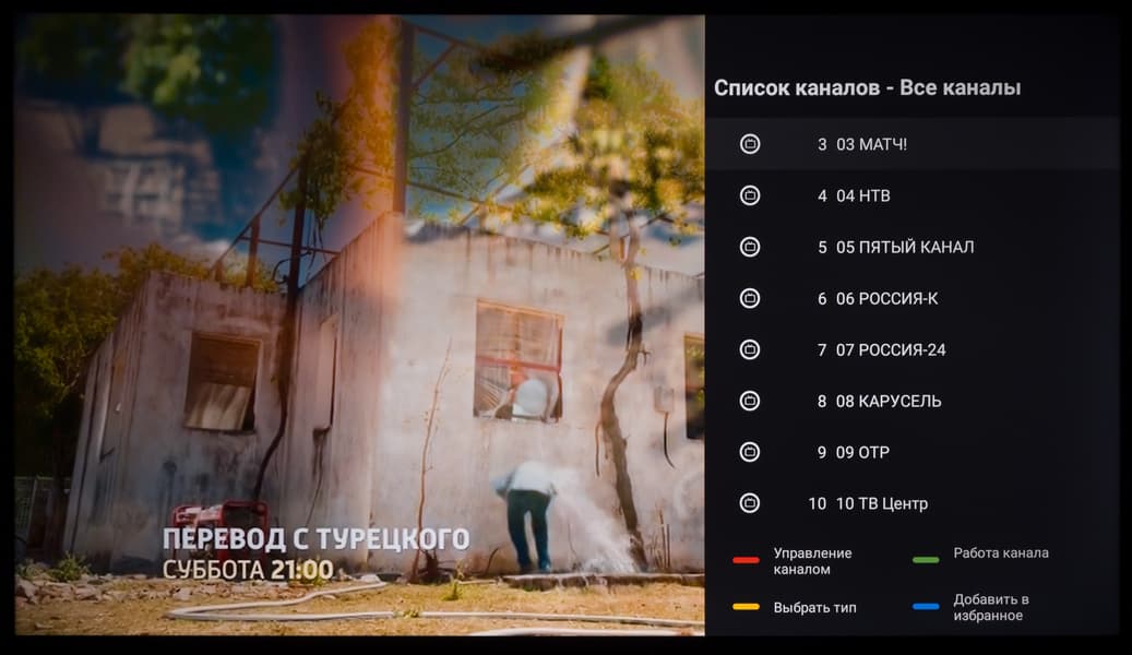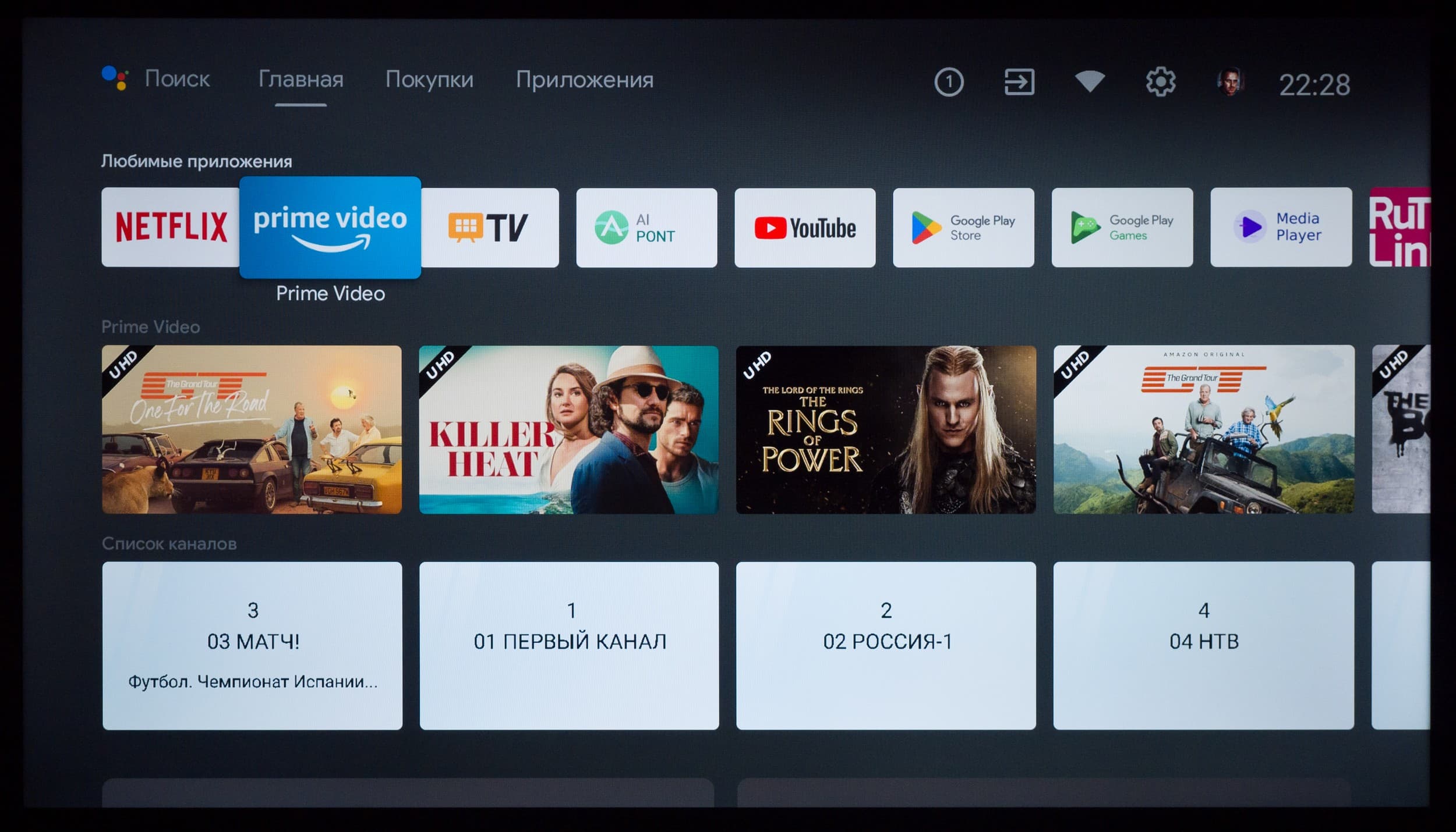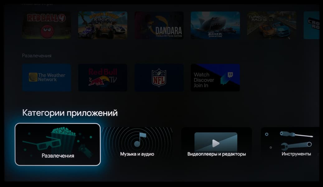Главный экран в Android TV многим хорошо знаком и представляет собой несколько горизонтальных лент с плитками избранных установленных приложений, избранного контента и рекомендуемого контента, предоставляемого различными программами, в том числе с разбивкой на каналы. Надписи слева над лентами поясняют, к чему относится содержимое лент.