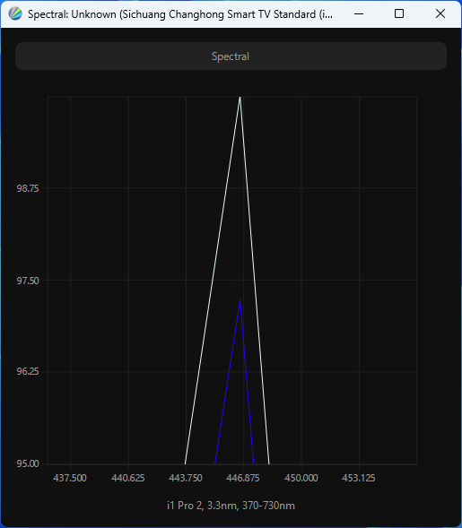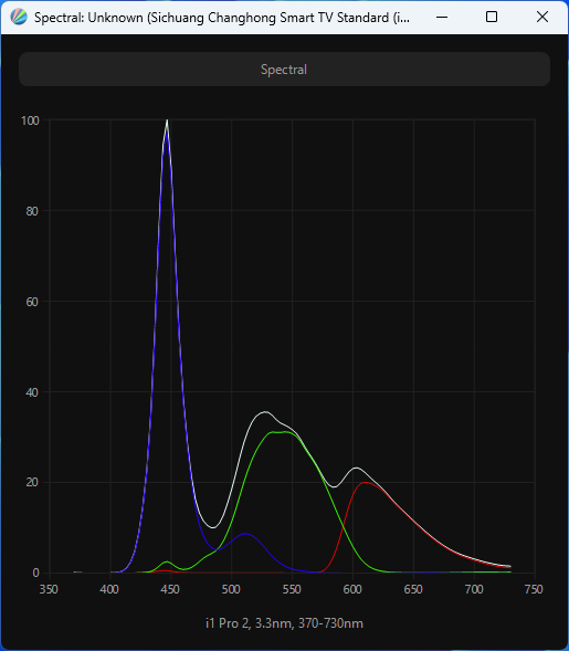 Виден классический пик синего, приходящийся на 447-448 нм, что неспособно обеспечить экран различными современными сертификатами безопасности. Перекрестное подмешивание компонент незначительное. Используется самая стандартная/классическая подсветка W-LED, способная продемонстрировать цветовой охват на уровне sRGB.