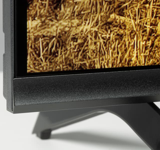 Обновленная встроенная акустическая система телевизора построена по классической стереофонической схеме 2.0 (так указано производителем) — без отдельно выделенного громкоговорителя низких частот (сабвуфера). Но если внимательно посмотреть на фотографии, то можно заметить наличие по одному дополнительному диффузору с каждой из сторон. Итого динамиков четыре штуки против двух у предшественника.
