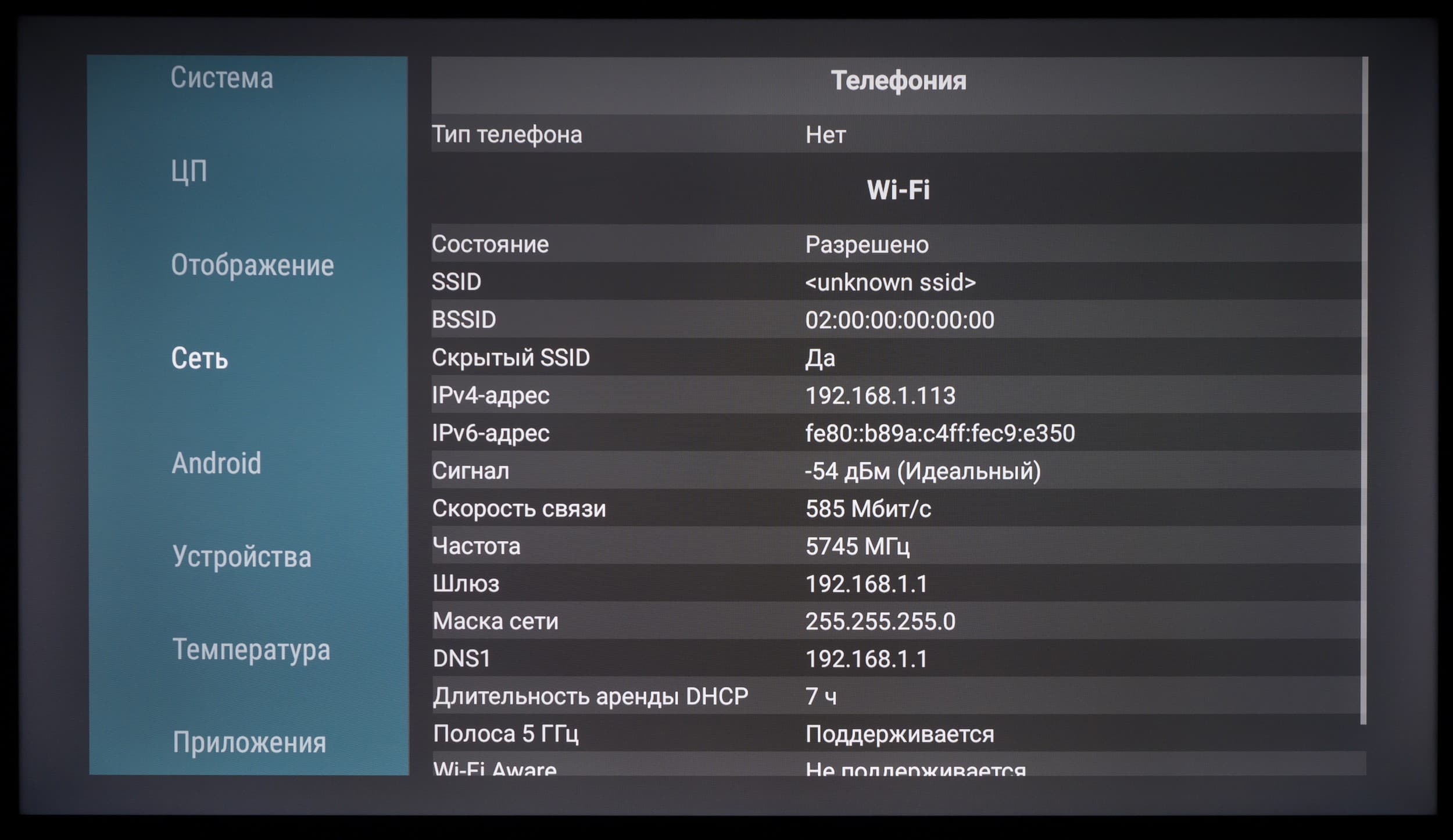 В развернутой сети 5 ГГц на базе роутера Keenetic Hooper, при нахождении телевизора в 5 метрах по прямой от него с преградой в виде монолитной стены, телевизор Hyundai продемонстрировал стабильную скорость подключения в 585-620 Мбит/c (тип подключения — 11ac/k/r/v, 2×2 80 МГц), которая иногда становилась выше. Это очень достойный результат.