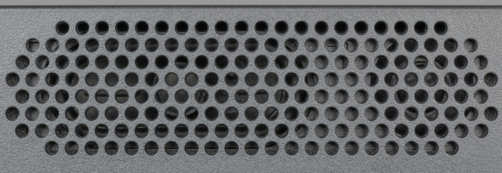На пластиковом кожухе сверху, сзади и снизу есть вентиляционные решетки. За двумя решетками на нижнем торце можно разглядеть по два отделенных друг от друга громкоговорителя (динамики, отвечающие за разные частоты воспроизведения). Это еще одно не самое очевидное изменение в сравнении с предшественником.
