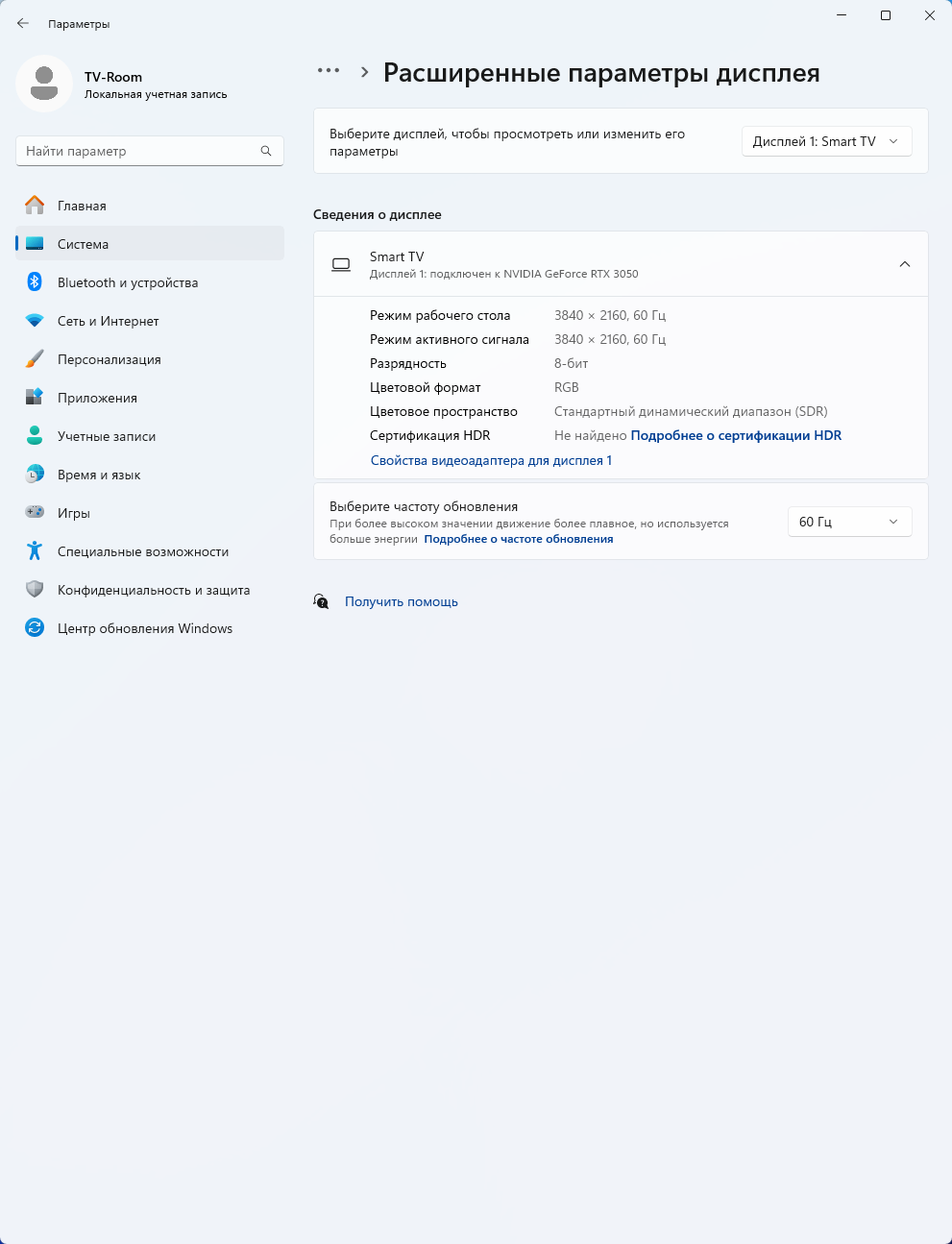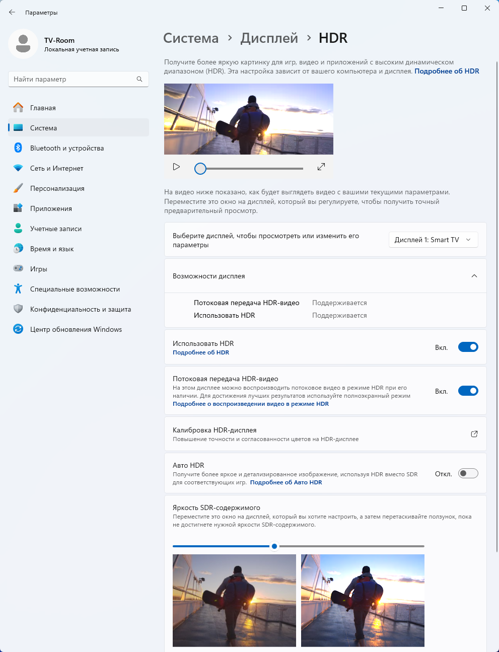 Под Windows 11 вывод в режиме HDR на данный телевизор возможен при выборе соответствующих опций в настройках дисплея.
