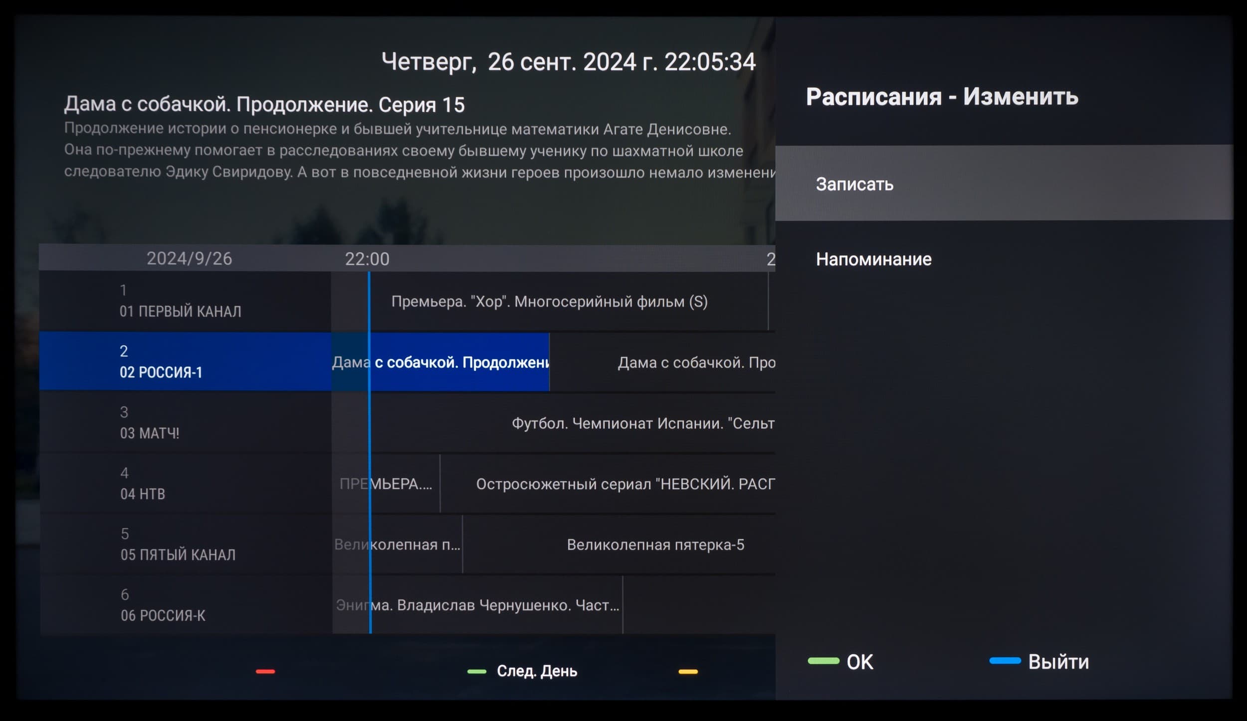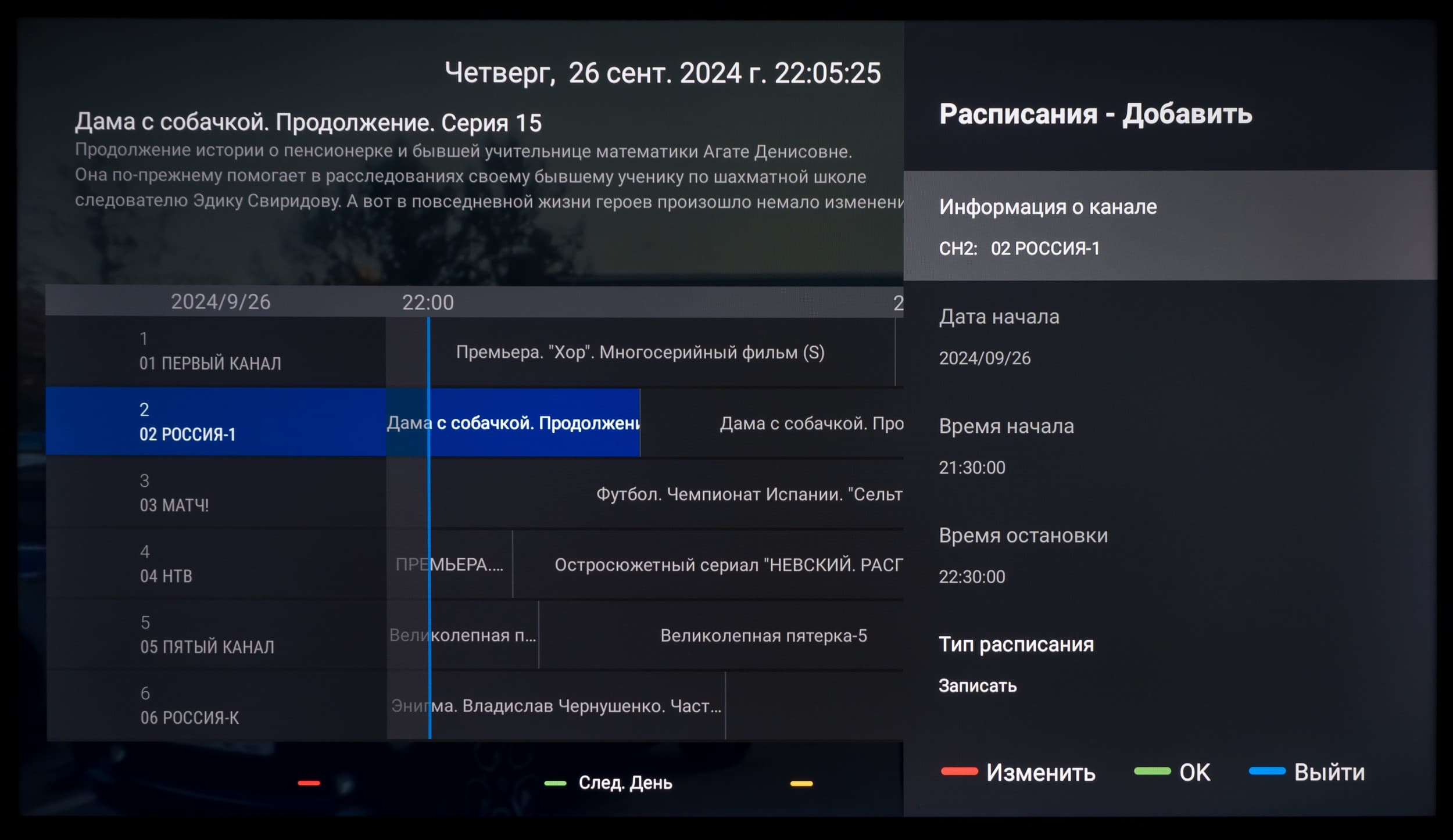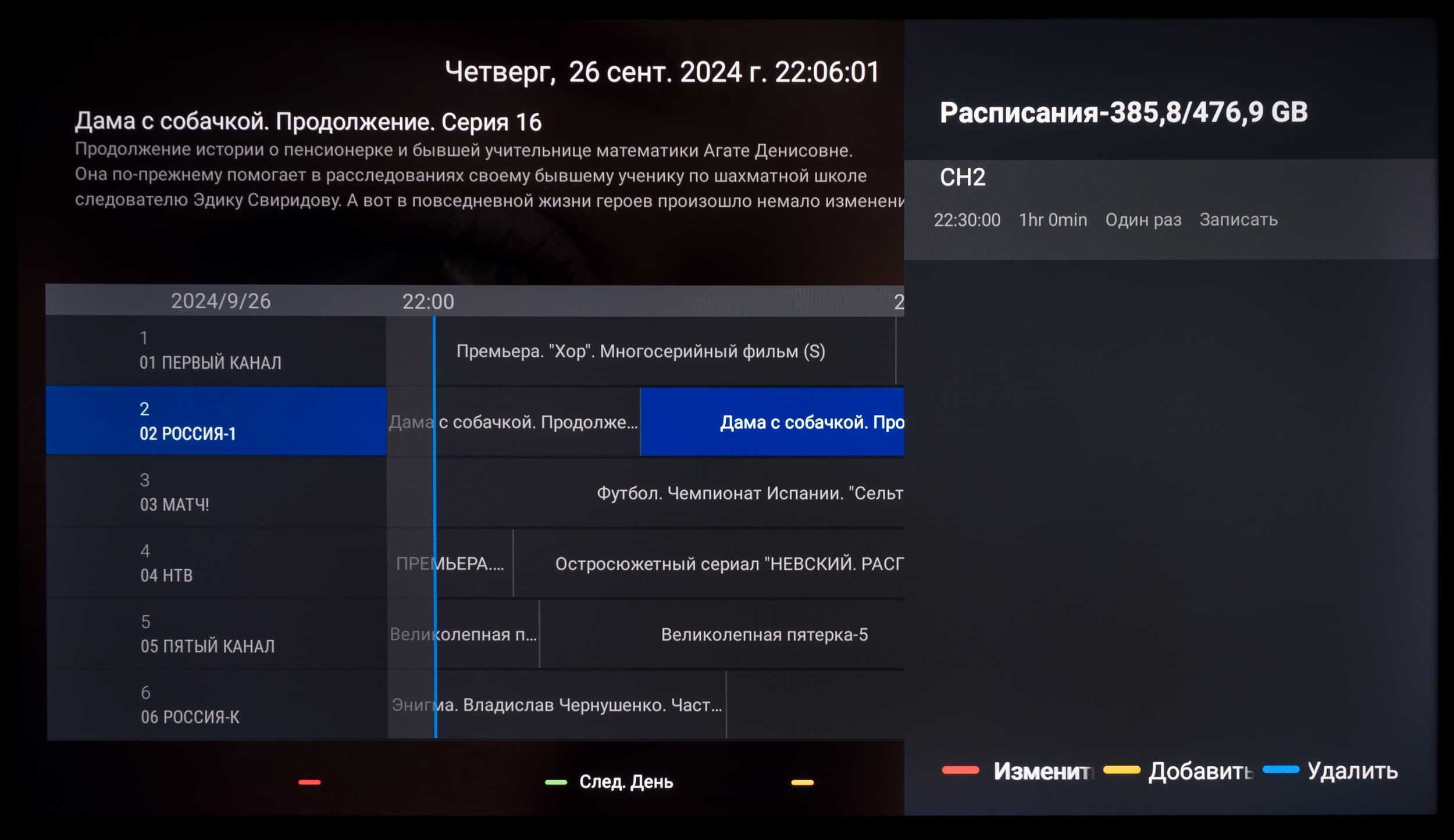 Есть у телевизора Hyundai и функция записи ТВ-программ с помощью планировщика — PVR (совмещена с отмеченной в официальных ТХ телевизора функцией TimeShift). Его настройка не столь проста (исключительно в первый раз), но в остальном претензий к работе функции не возникло. Система быстро определила подключенный диск и предложила использовать именно его (c файловой системой NTFS), создав специальную папку для записанных файлов. Также поддерживается запись на накопители с FAT32.