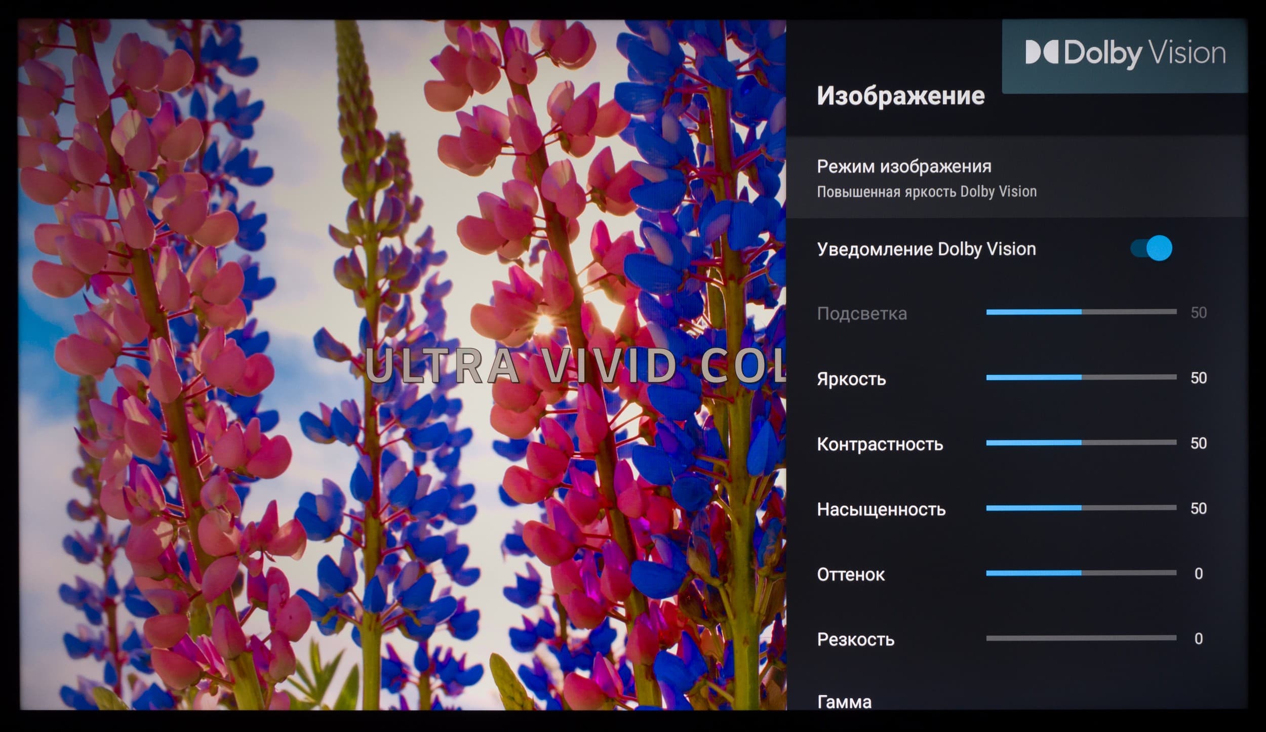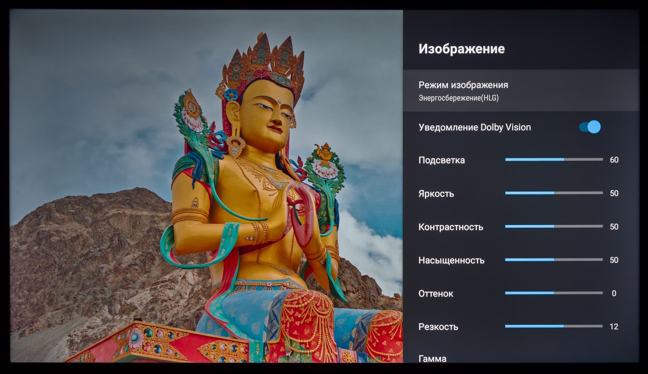 - Поддержка HDR-контента основных стандартов — HDR10, HLG и Dolby Vision (для каждого из них представлены свои предустановленные режимы, но поддержка в любом случае формальная из-за ограничений цветового охвата, отсутствия системы локального управления подсветкой и не слишком высокой максимальной яркости модели)