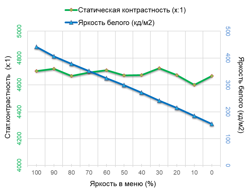После компенсации дисбаланса RGB и приведении белого поля к нейтральному виду (6500 К) рабочий диапазон сместился к 154—442 нит. Минимальные значения в обоих случаях достаточно велики, но изменения яркости линейно — без резких перепадов.