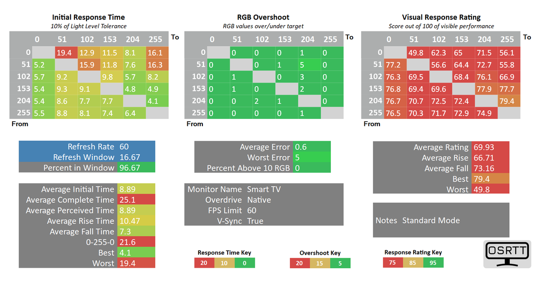 Для рассматриваемого решения производитель указал время отклика в 6,5 мс, вероятно полученное по методике GtG с большими допусками (по стандарту VESA, 10%—90%). Для данного материала мы также воспользовались этим стандартным допуском.