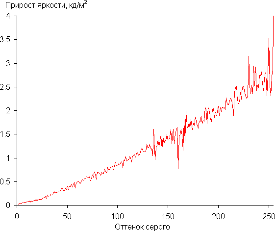 Реальная гамма-кривая ближе к стандартной в случае варианта Темная, поэтому далее мы измерили яркость 256 оттенков серого (от 0, 0, 0 до 255, 255, 255) при этом значении. График ниже показывает прирост (не абсолютное значение!) яркости между соседними полутонами: