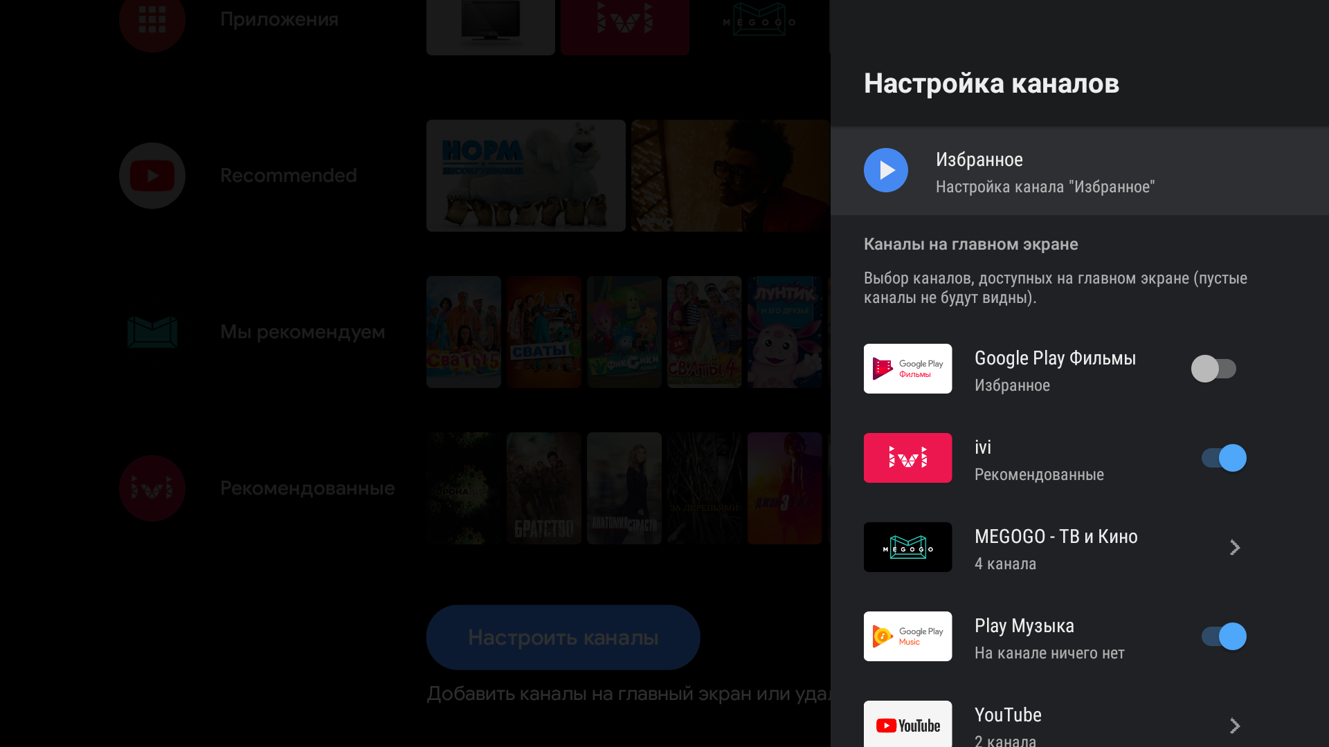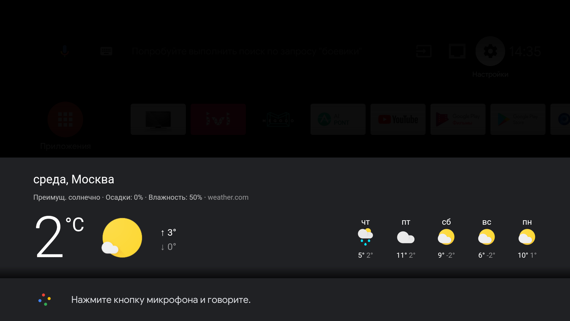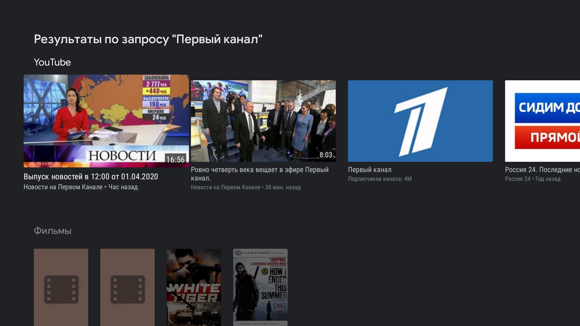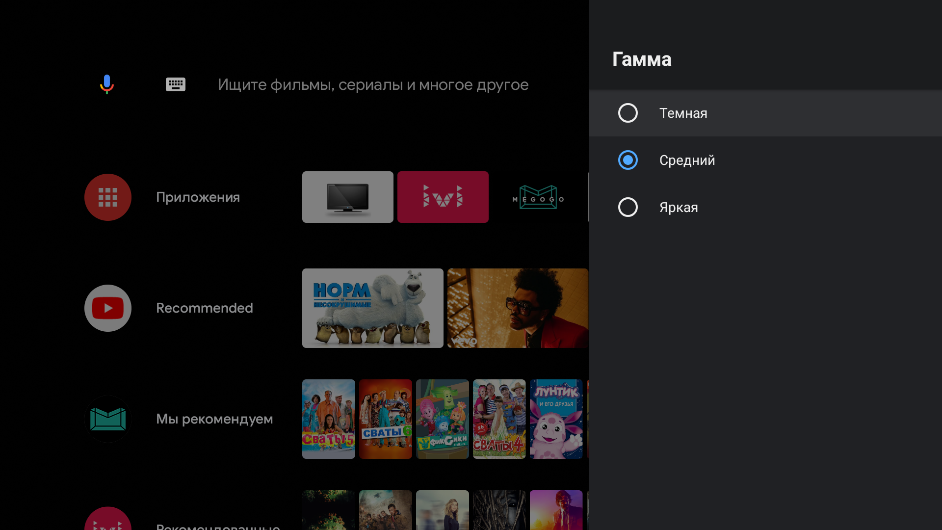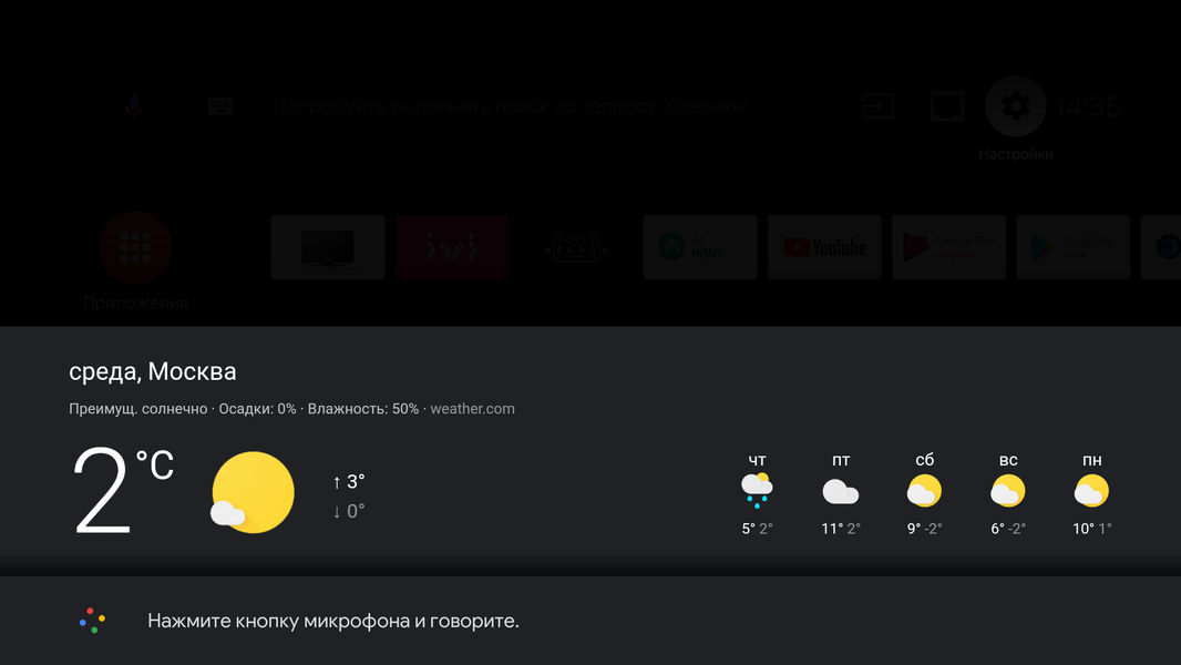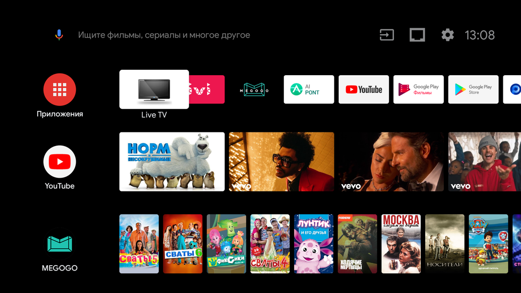 Домашняя страница в Android TV представляет собой несколько горизонтальных лент с плитками избранных установленных приложений и рекомендуемого контента. Кружки с подписями слева поясняют, к чему относятся содержимое лент, и позволяют запустить соответствующую программу (или выводят список установленных программ — кружок Приложения). В верхней части страницы есть значки-кнопки голосового и текстового ввода строки поиска, вывода системных сообщения, выбора входов, индикации подключения к сети, доступа к настройкам и часы.