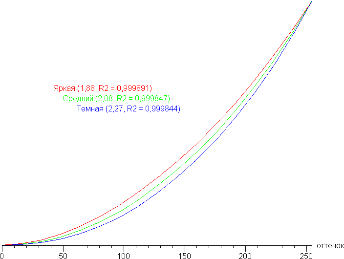 Для оценки характера роста яркости на шкале серого мы измерили яркость 17 оттенков серого при различных значениях параметра Гамма.
