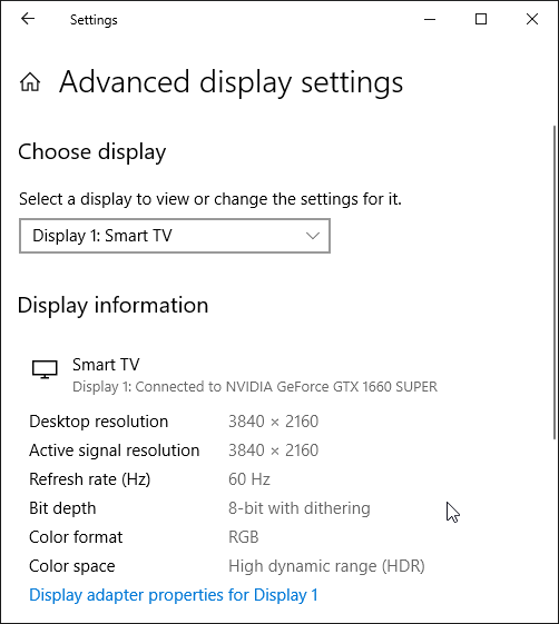 Под Windows 10 вывод в режиме HDR на данный телевизор возможен при выборе соответствующих опций в настройках дисплея. При разрешении 4К и 60 Гц вывод идет в режиме 8 бит на цвет, дополненных динамическим смешением цветов (видимо, с помощью видеокарты на аппаратном уровне).