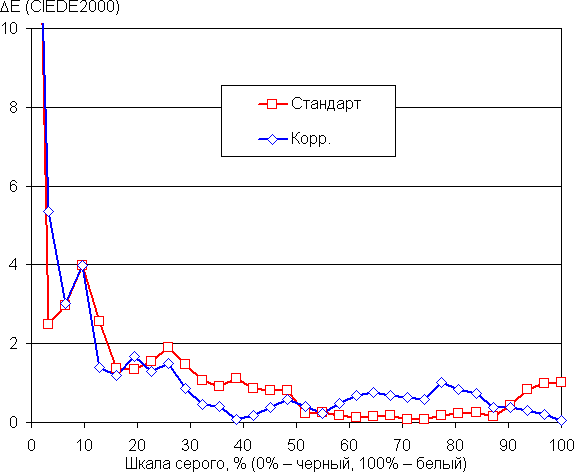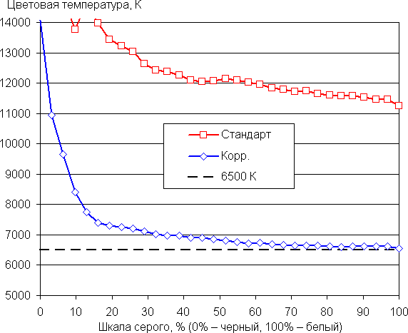 Графики ниже показывают цветовую температуру на различных участках шкалы серого и отклонение от спектра абсолютно черного тела (параметр ΔE) для профиля Стандарт (выбран по умолчанию и обеспечивает максимальную яркость и контрастность) и после ручной коррекции (настройки интенсивности трех цветов: 0/−20/−52):
