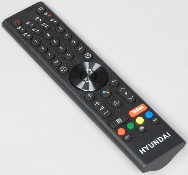 Корпус пульта изготовлен из черного пластика с матовой поверхностью. Обозначения кнопок контрастные, основные кнопки достаточно крупные, как и надписи на них. Однако ряд вспомогательных кнопок в передней части уже очень мелкие, как и их обозначения. Изготовлены кнопки из резиноподобного материала, исключение — кнопка OK и кольцо курсорных кнопок. Самих кнопок много, но, как показывает практика, пользоваться такими пультами удобнее, чем лаконичными, с парой-другой кнопок. Пульт гибридный, он может работать как по ИК, так и по Bluetooth. По ИК пульт работает до сопряжения с телевизором или тогда, когда телевизор находится в глубоком сне. Во всех остальных случаях ИК-передатчик не работает, и команды передаются по Bluetooth. В передней части пульта есть отверстие микрофона. Голосовой помощник от Google запускается при нажатии на кнопку с цветастыми кружочками, также его можно запустить с домашней страницы. Этот помощник поможет найти контент, который предоставляют ряд программ, и ответить на какие-то вопросы (показывает и проговаривает ответ), например, какая сейчас погода за окном. Однако непосредственно с самим ТВ интеграции нет, то есть голосом не получится переключать ТВ-каналы, менять громкость и т. д.