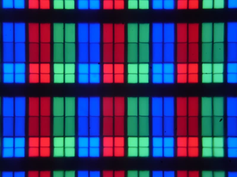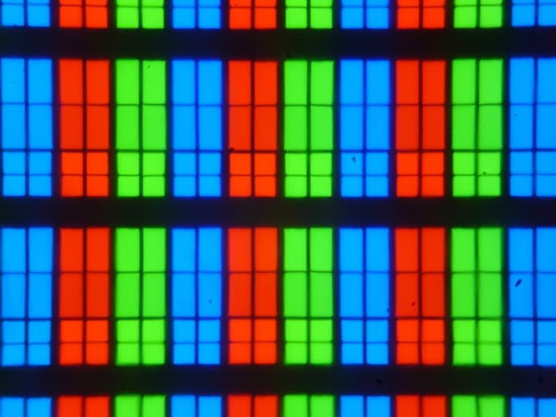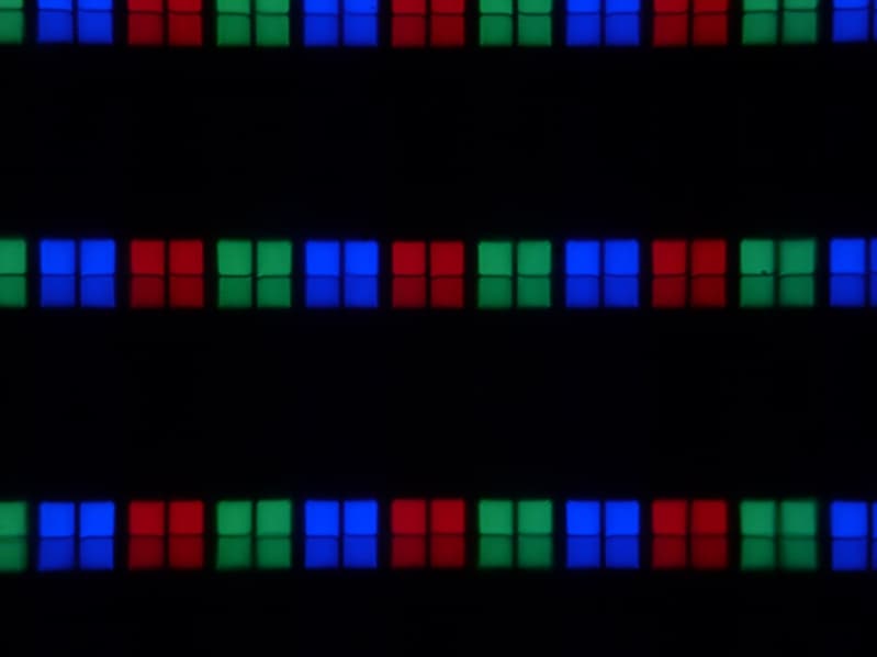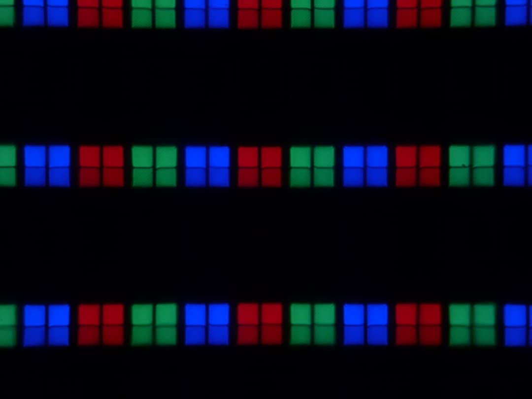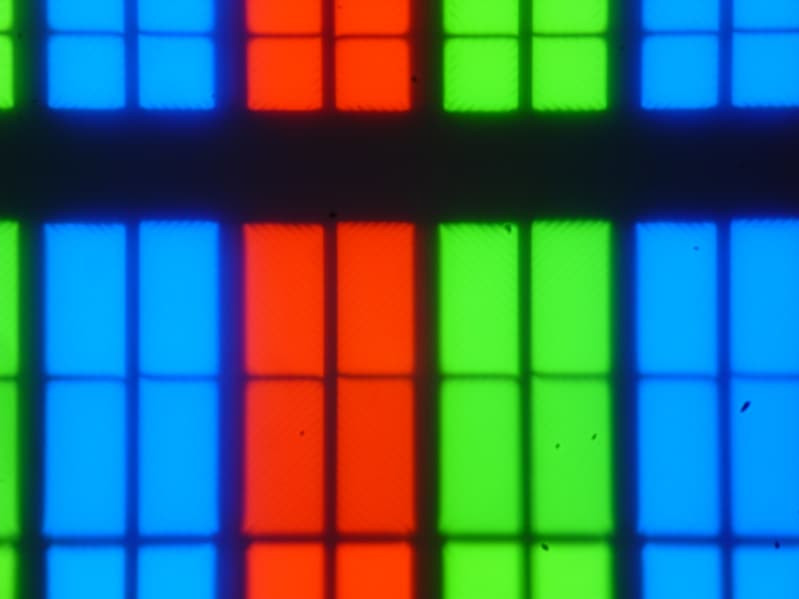 Выявленные характеристики экрана позволяют предположить, что в данном телевизоре установлена матрица типа *VA. Микрофотографии не противоречат этому (черные точки — это пыль на матрице фотоаппарата):