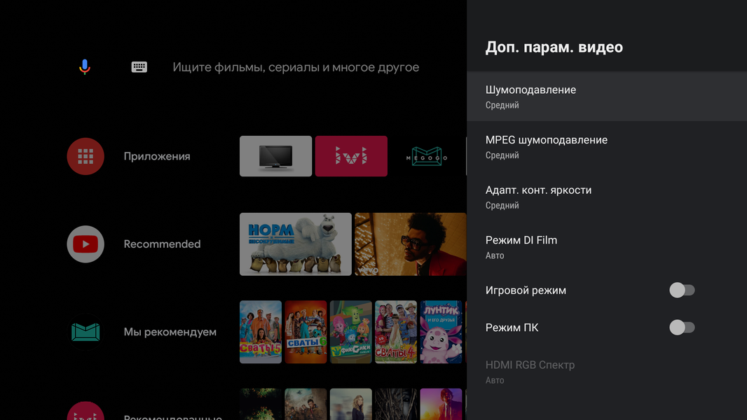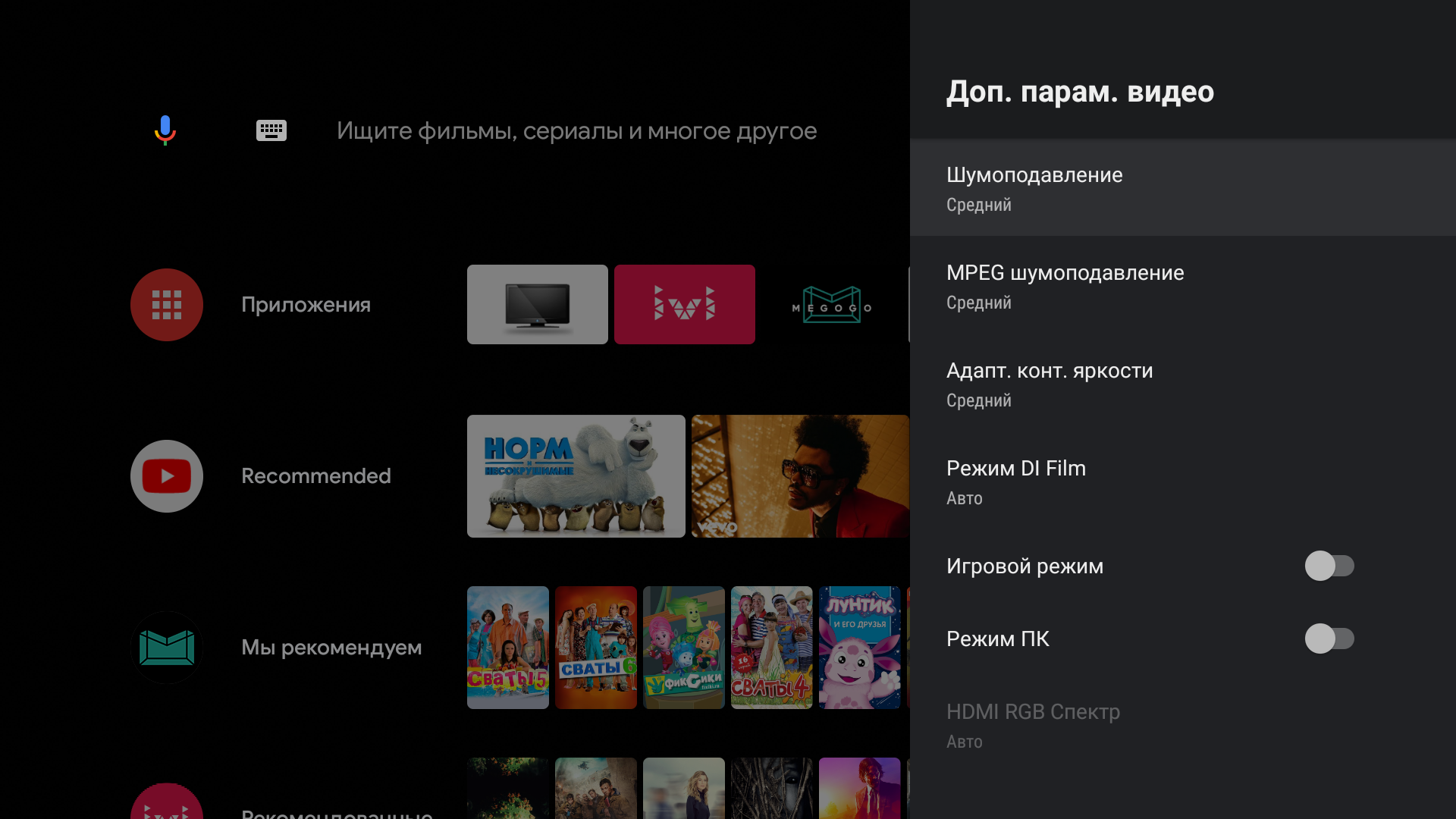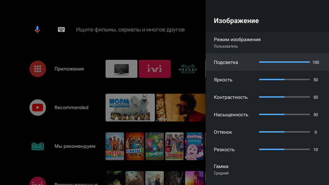 Настройки изображения сохраняются раздельно для нескольких групп — для всех приложений, для всех внешних входов и для всех ТВ-каналов. Кнопка на пульте с изображением квадратиков выводит поверх текущего изображения список приложений, чтобы пользователь мог быстро запустить нужное, а кнопка YouTube — запускает соответствующую программу.