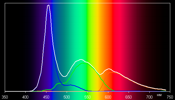 Ниже приведен спектр для белого поля (белая линия), наложенный на спектры красного, зеленого и синего полей (линии соответствующих цветов):