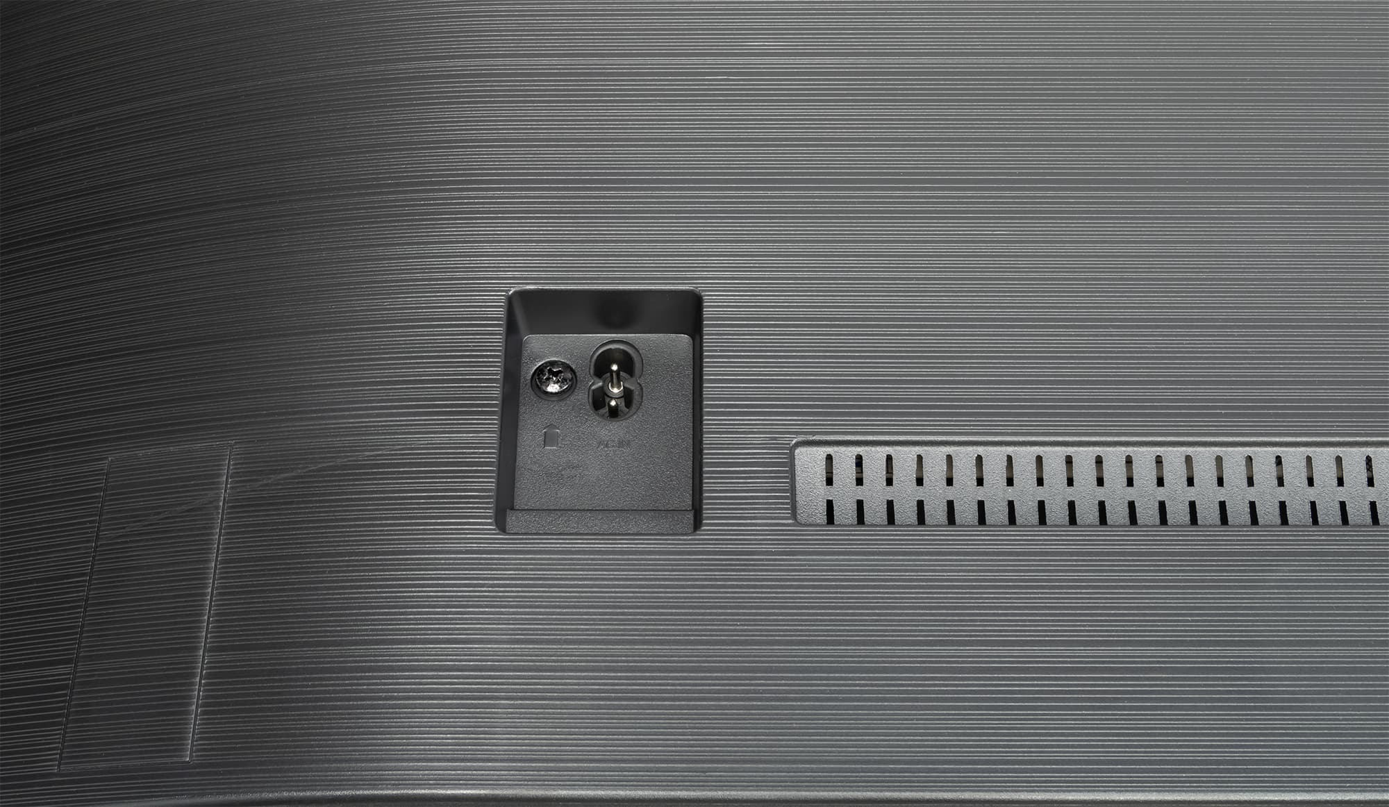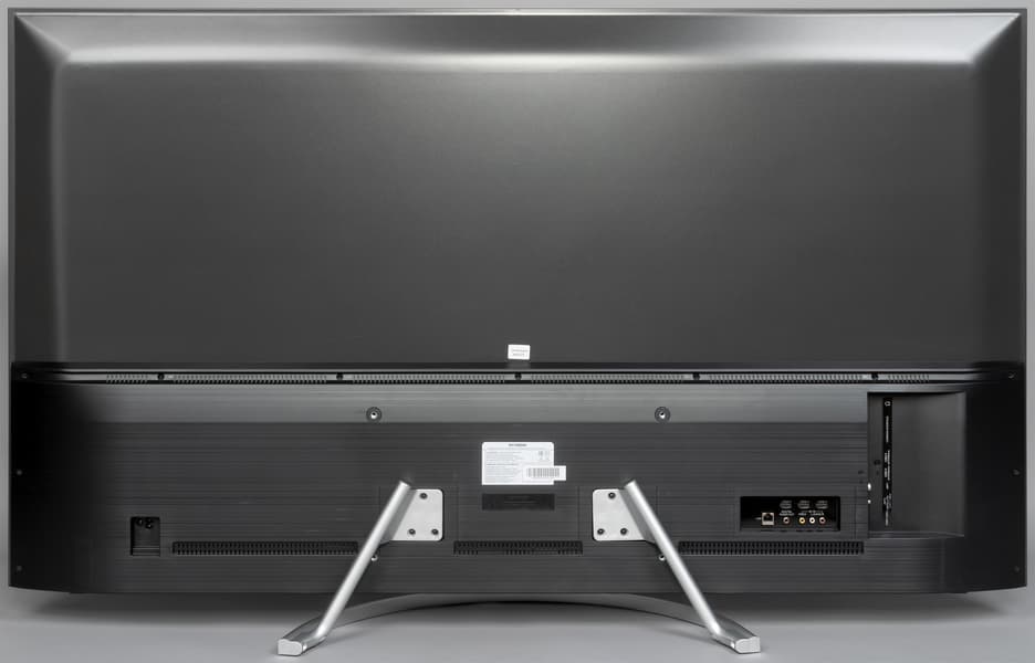 Задняя панель условно в верхней части представляет собой единую деталь, закрывающую телевизор сзади и переходящую в окантовку экрана сверху и с боков. Изготовлена задняя панель из тонкого листа стали и имеет стойкое серебристое темно-серое матовое покрытие. Выступающий назад кожух в нижней части с заходом на нижний торец изготовлен из черного пластика с матовой поверхностью. Интерфейсные разъемы размещены в двух нишах на этом кожухе. Часть разъемов направлена назад, часть вбок. Спереди дотягиваться до разъемов, направленных вбок, например, до разъема для наушников достаточно удобно. Подключать кабели к разъемам, направленным назад, будет неудобно при размещении телевизора на стене. В верхней части телевизор относительно тонкий.