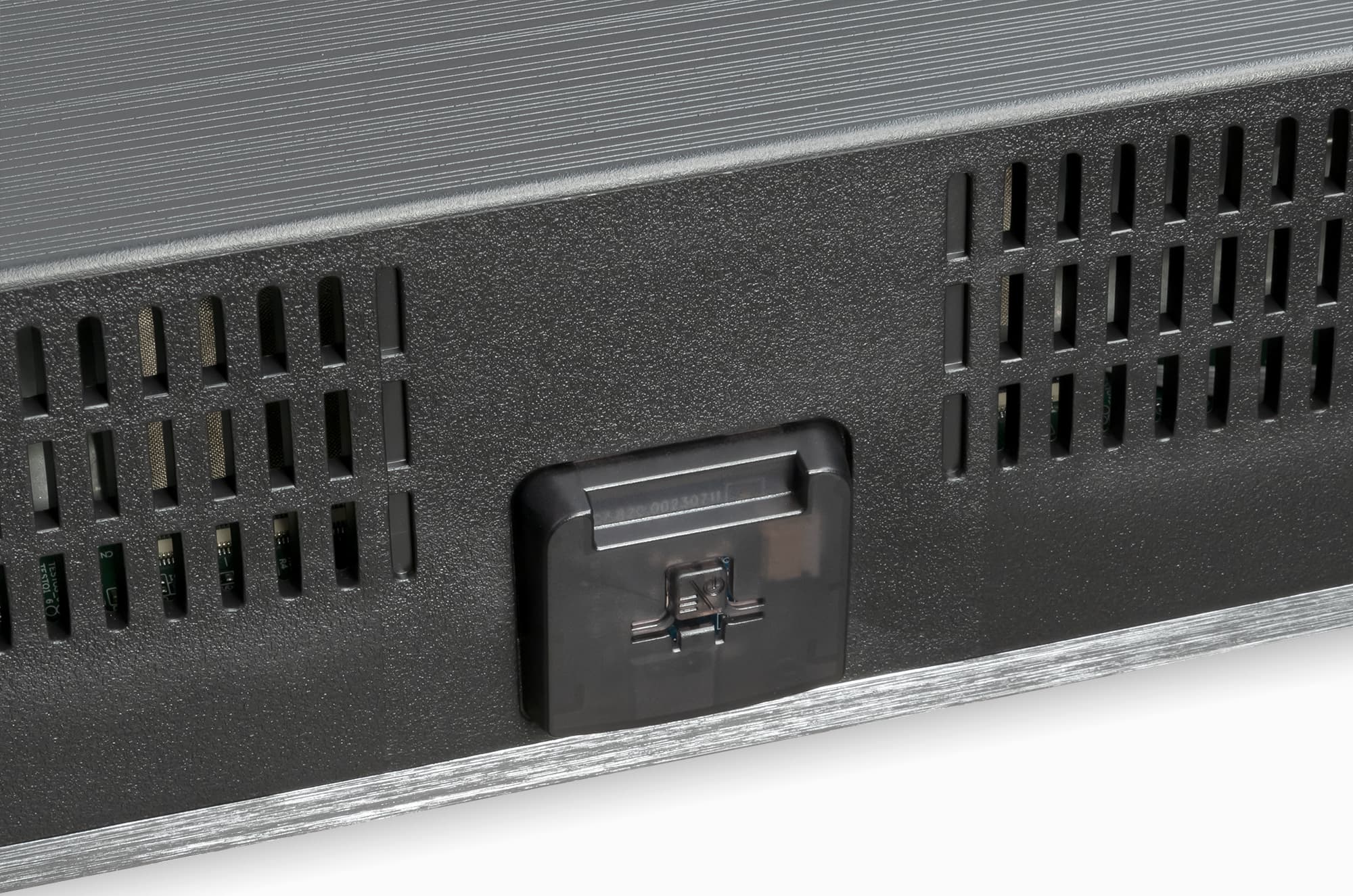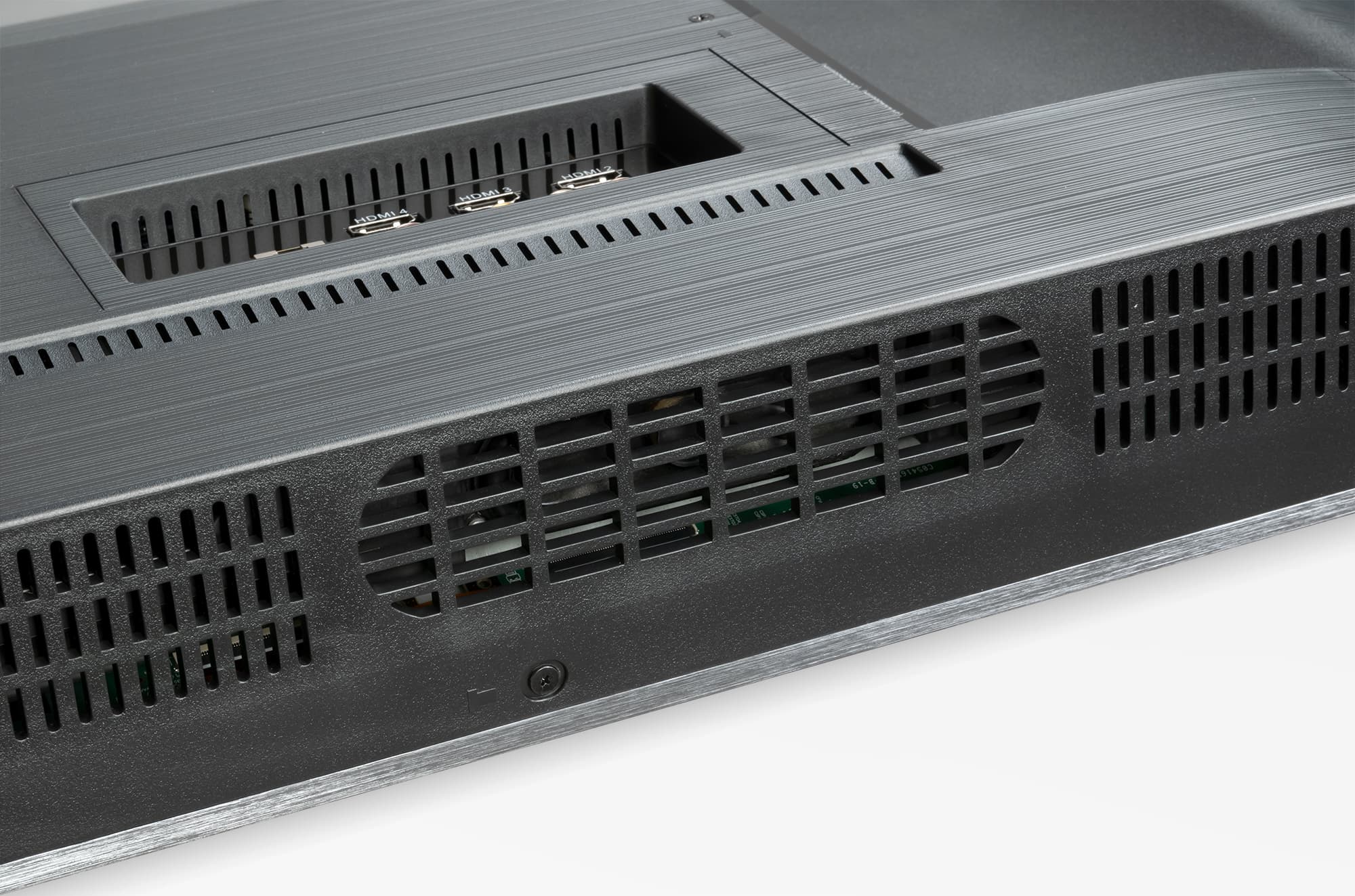 На пластиковом кожухе сверху, снизу и сзади есть вентиляционные решетки. За двумя решетками на нижнем торце можно разглядеть громкоговорители с вытянутыми диффузорами.