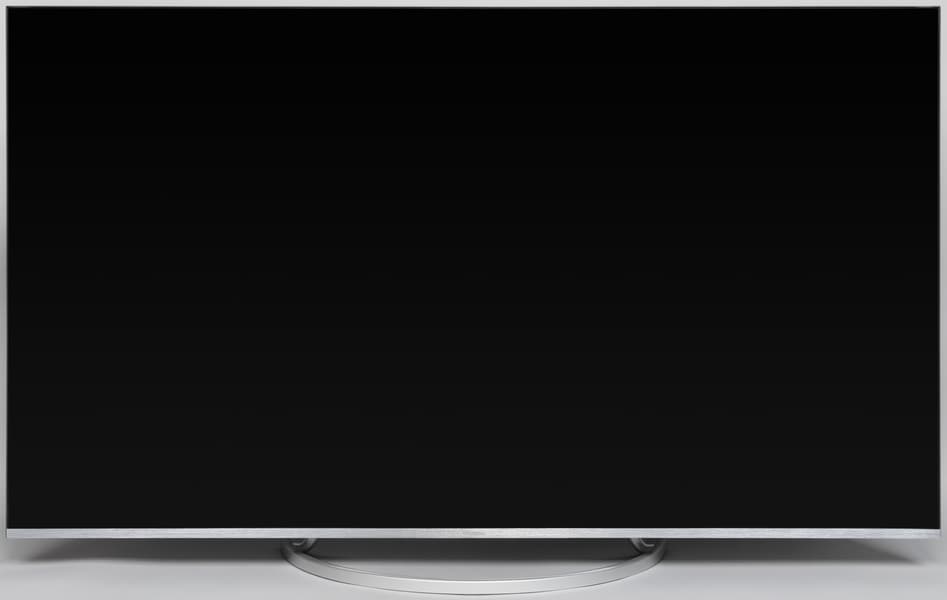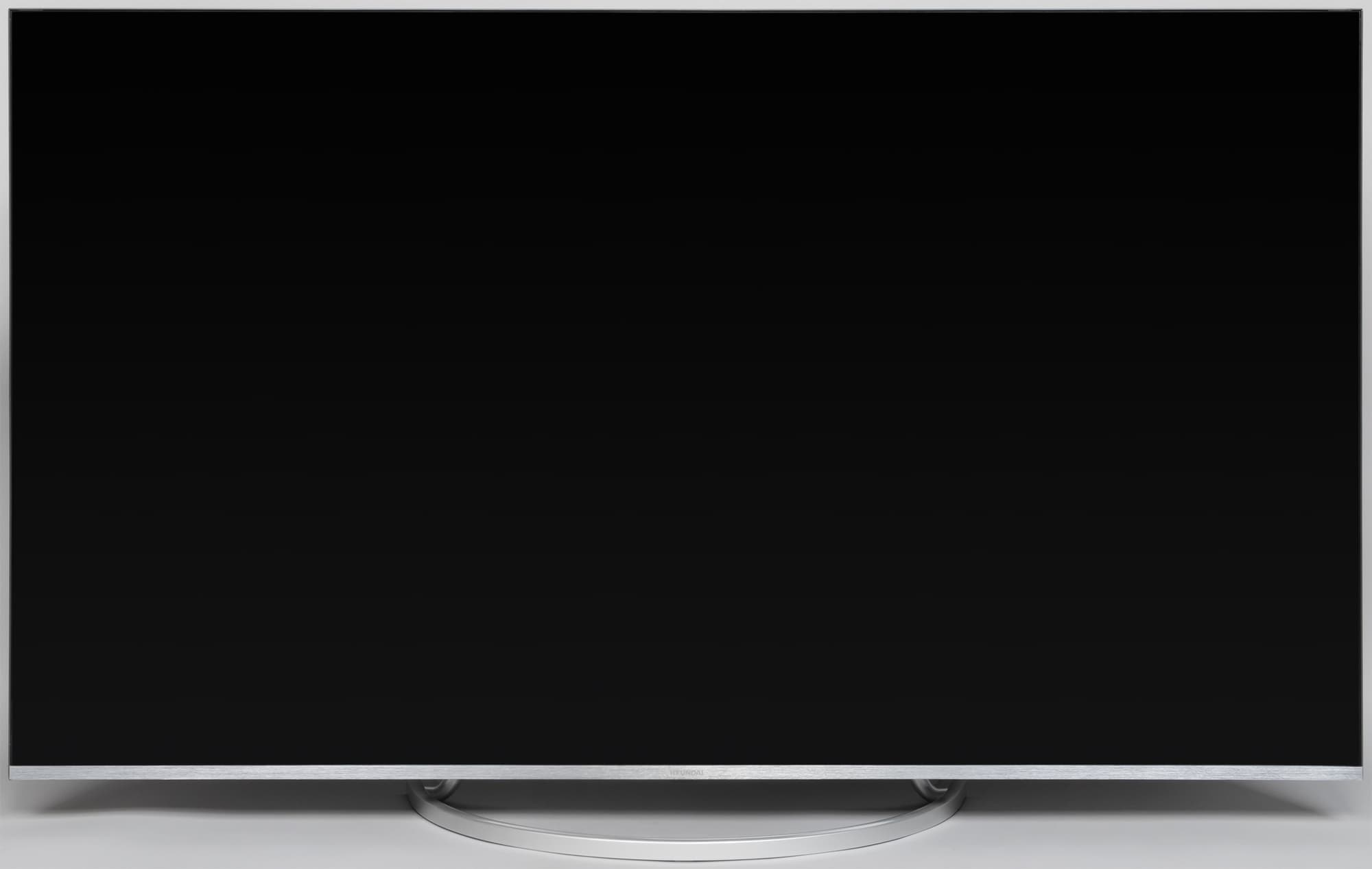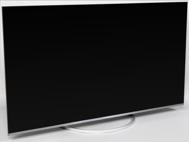 Дизайн можно назвать условно безрамочным, так как экран выглядит как монолитная поверхность, ограниченная сверху и с боков узкой окантовкой и только снизу есть узкая планка, выступающая вперед от плоскости экрана. Планка изготовлена из алюминия и лишена покрытия. Ее передняя поверхность матовая с фактурой шлифованного, но неполированного металла, а вот плоская фаска сверху на планке — зеркально гладкая. С этой фаской связан главный эргономический просчет, так как есть большая вероятность, что в ней будет отражаться свет от потолочного светильника и мешать просмотру ТВ. По центру планки располагается логотип в виде наклеенных букв с зеркальной поверхностью. Внешняя поверхность ЖК-матрицы чуть-чуть матовая — зеркальность очень хорошо выражена. Антибликового покрытия в явном виде нет. Поверхность экрана с виду черная и на ощупь жесткая.