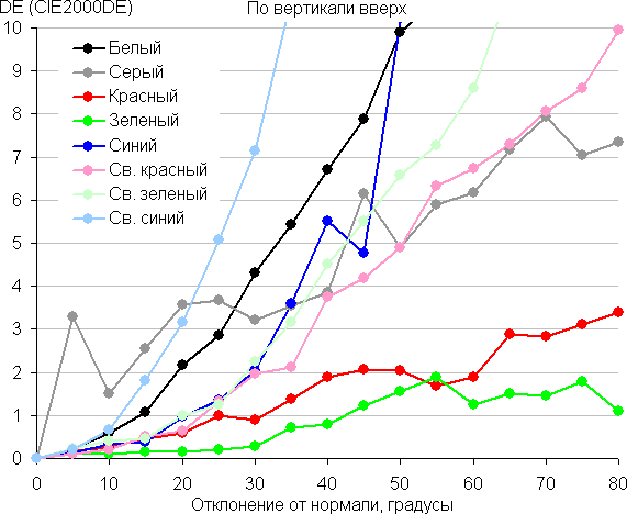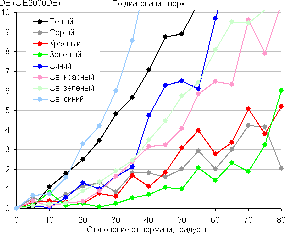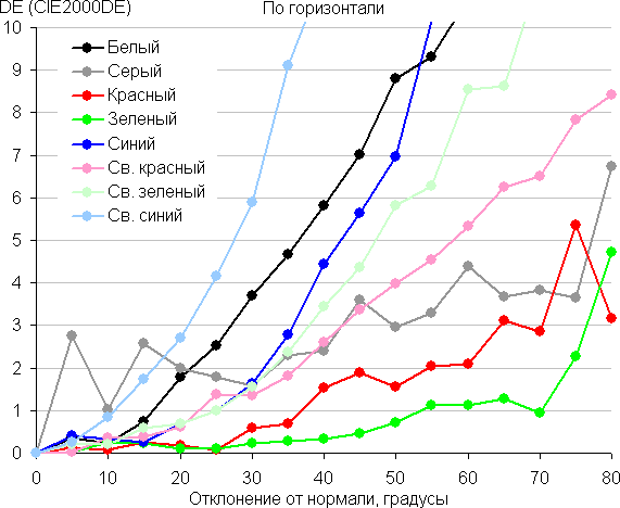 Для количественной характеристики изменения цветопередачи мы провели колориметрические измерения для белого, серого (127, 127, 127), красного, зеленого и синего, а также светло-красного, светло-зеленого и светло-синего полей во весь экран с использованием установки, подобной той, что применялась в предыдущем тесте. Измерения проводились в диапазоне углов от 0° (датчик направлен перпендикулярно к экрану) до 80° с шагом в 5°. Полученные значения интенсивностей были пересчитаны в отклонение ΔE относительно замера каждого поля при перпендикулярном положении датчика относительно экрана. Результаты представлены ниже: