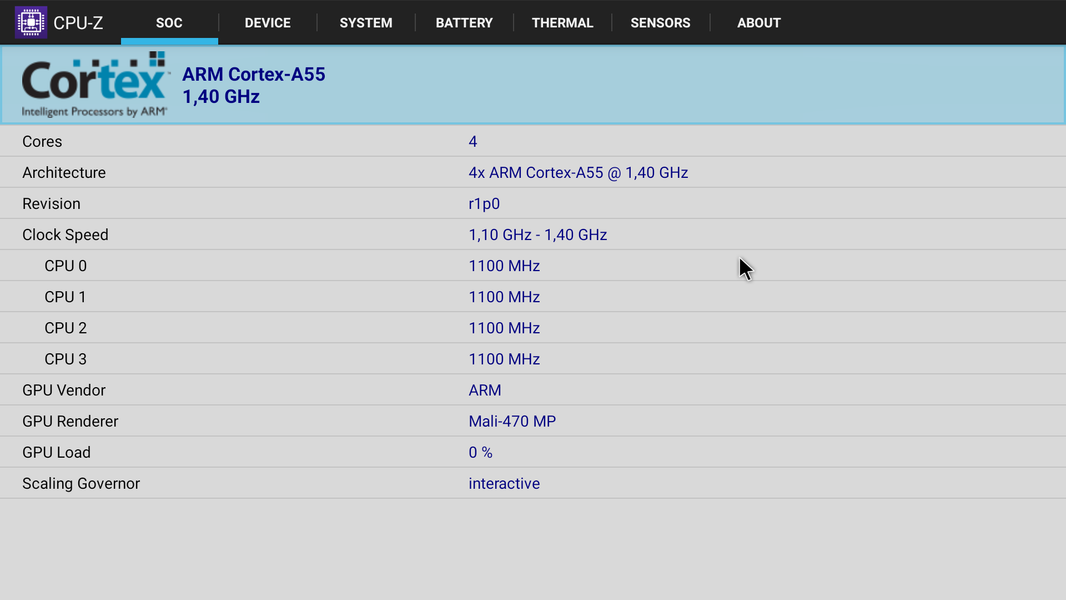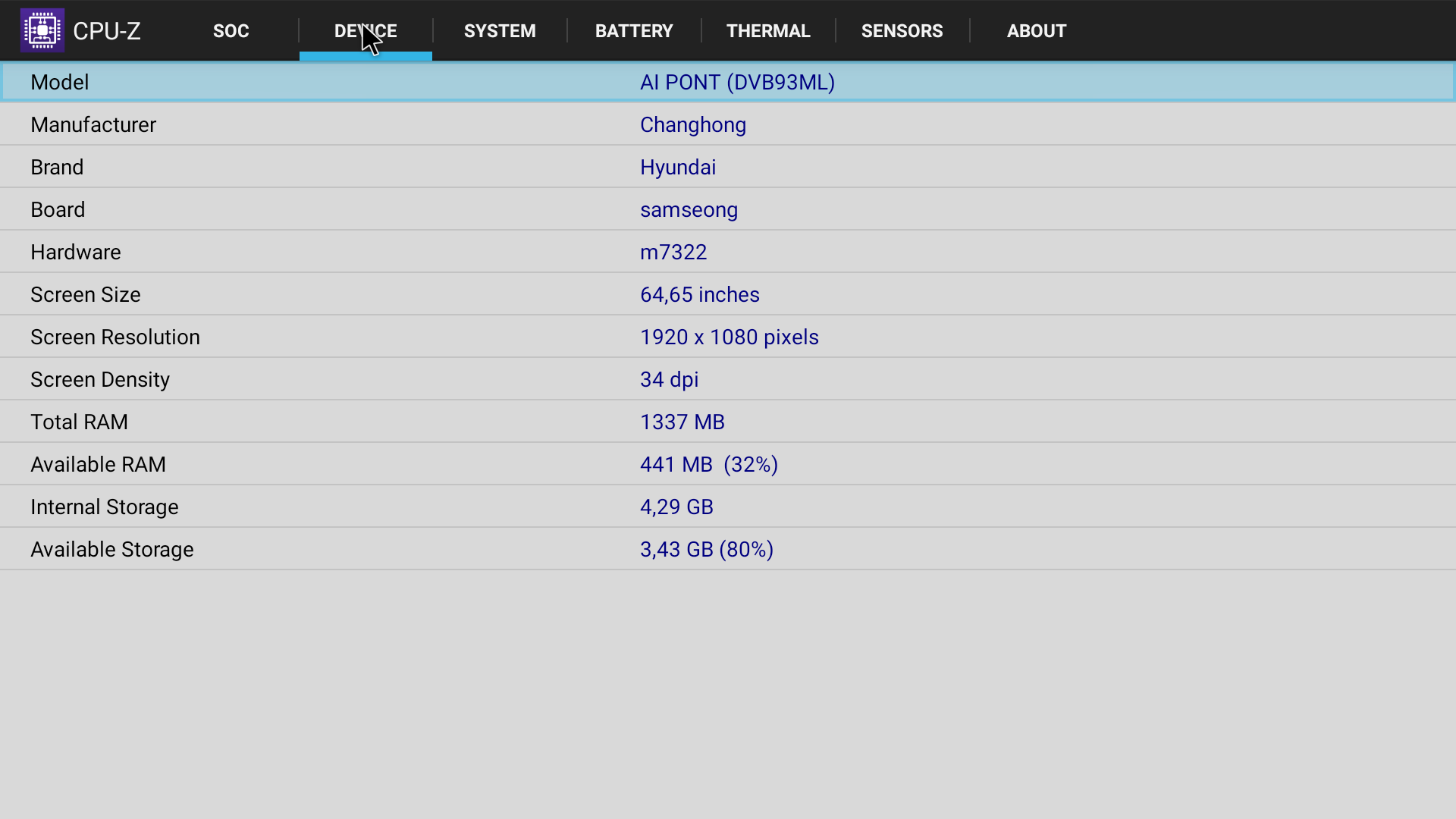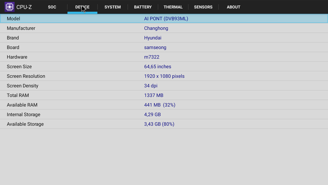 Программной платформой для этого ТВ служит операционная система Android TV, основанная на Android версии 9.0. Конфигурацию аппаратной части поясняют данные программы CPU-Z:
