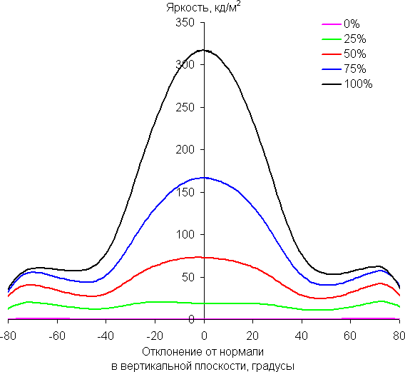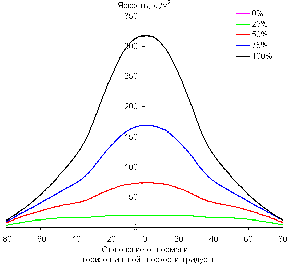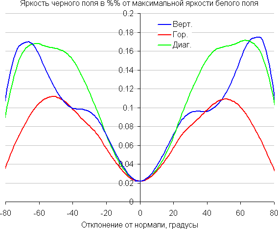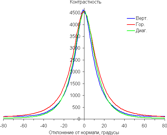 Отметим плавное, но все же относительно быстрое уменьшение яркости при отклонении от перпендикуляра к экрану во всех трех направлениях. Под очень большими углами графики яркости некоторых полутонов пересекаются, то есть яркость оттенков инвертируется, но в реальной ситуации этого видно не будет. По скорости снижения яркости углы обзора относительно узкие. Яркость черного поля при отклонении от перпендикуляра к экрану возрастает, но всего до примерно 0,18% от максимальной яркости белого поля. Это очень хороший результат. Контрастность в диапазоне углов ±82° не опускается ниже отметки 10:1.
