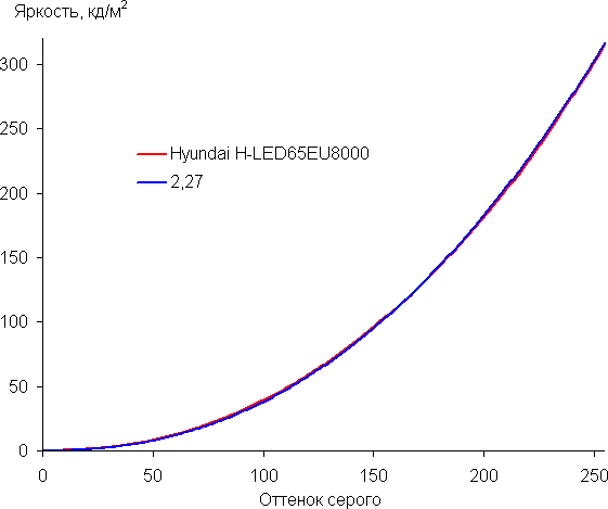 Аппроксимация полученной гамма-кривой дала показатель 2,27, что немного выше стандартного значения 2,2. При этом реальная гамма-кривая мало отклоняется от аппроксимирующей степенной функции: