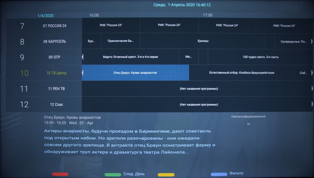 Тюнер даже зацепился за пару аналоговых каналов, но изображения по сути не было — только помехи. Есть хорошая поддержка электронной программы передач — можно посмотреть, что именно идет на текущем и других каналах, запрограммировать просмотр или запись программы или сериала и т. д.