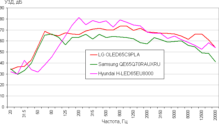 Громкость встроенной акустической системы для жилой комнаты, соответствующей по размерам данной диагонали экрана, достаточная, есть даже большой запас. Стереофонический эффект выражен отчетливо. Присутствуют высокие и средние частоты, низких — нет. Явно есть паразитные резонансы корпуса, однако выраженного дребезжания нет даже на максимальной громкости. В целом для класса встроенной в телевизор акустики ее качество приемлемое. Сравним АЧХ этого ТВ с АЧХ двух телевизоров высшего класса (30 дБ — это фоновый уровень в помещении):
