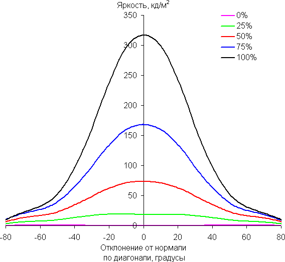 Чтобы выяснить, как меняется яркость экрана при отклонении от перпендикуляра к экрану, мы провели серию измерений яркости черного, белого и оттенков серого в центре экрана в широком диапазоне углов, отклоняя ось датчика в вертикальном, горизонтальном и диагональном направлениях.
