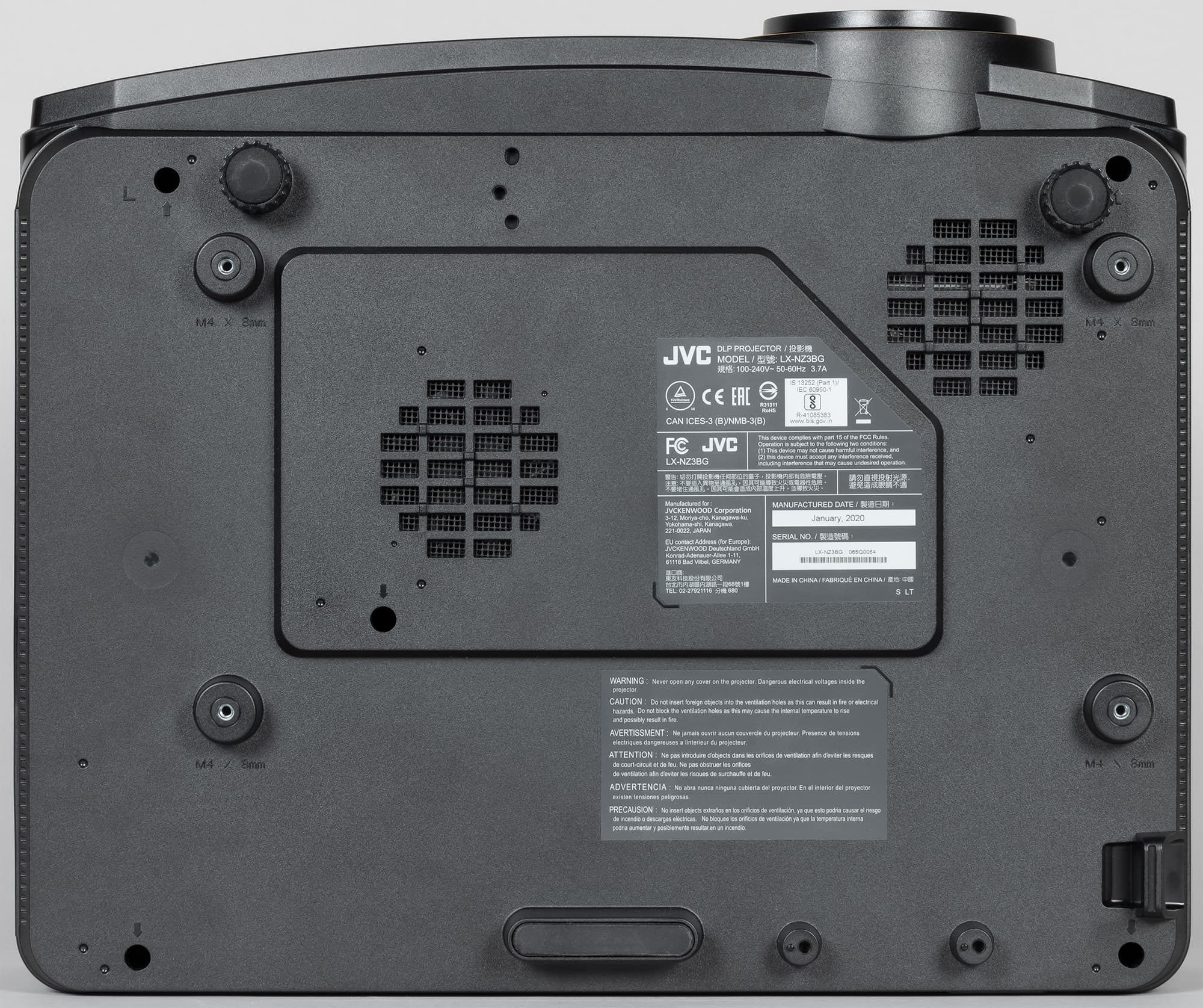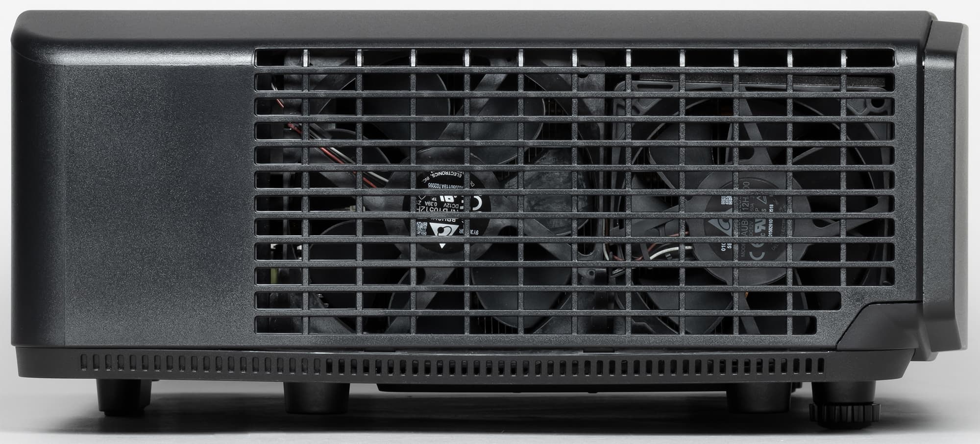 Проектор оснащен двумя передними вывинчивающимися из корпуса ножками (примерно на 25 мм, пластиковая стойка) с резиновыми накладками. Эти ножки позволяют устранить небольшой перекос и/или немного приподнять переднюю часть проектора при его размещении на горизонтальной поверхности. Сзади проектор опирается на ножку с широкой резиновой подошвой. В днище проектора вделаны четыре металлические втулки с резьбой, предназначенные для монтажа на потолочном кронштейне. Также есть две вентиляционные решетки, за одной из которых можно рассмотреть небольшой вентилятор, работающий на вдув.