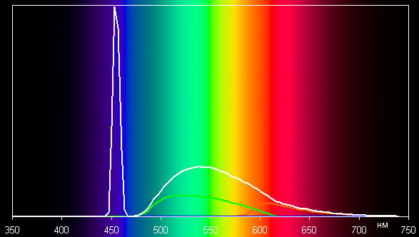 Видно, что красный и зеленый цвета разделены слабо, а в случае синего пик очень узкий, что характерно для лазерного излучения. Спектр белого всегда выше спектров чистых цветов (в средней области в основном за счет добавленного желтого цвета), что приводит к дисбалансу яркости чистых цветов относительно яркости белого цвета.