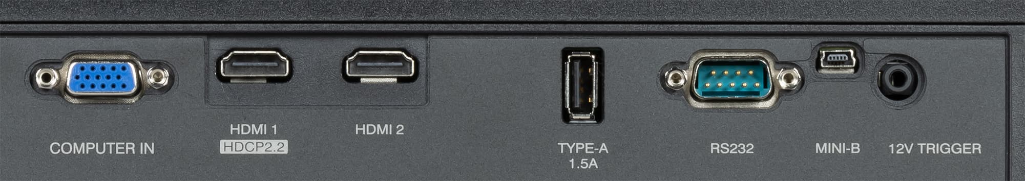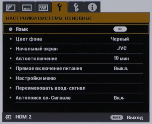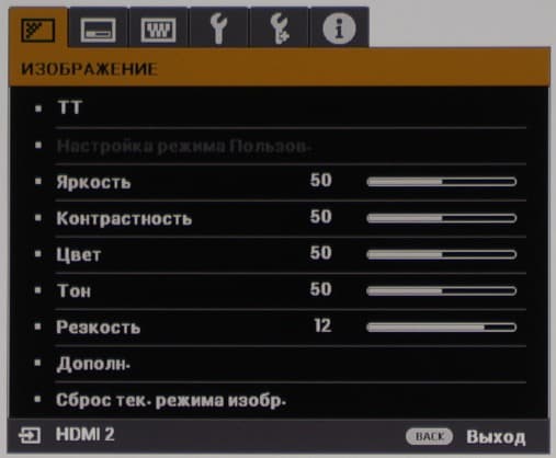 Проектор оснащен двумя HDMI-входами и единственным аналоговым видеовходом — VGA. Входы HDMI неравнозначные, только HDMI1 (видимо, версии 2.0) поддерживает HDCP 2.2. С практической точки зрения это означает, что именно он поддерживает не просто видеосигнал с разрешением 4К, но и с максимально возможной цветовой четкостью (кодирование цвета 4:4:4) при частоте 60 кадр/с. Есть автоматическое обнаружение сигнала на входах (его можно отключить). Вход управления экрана с электроприводом можно подключить к разъему 12V Trigger, тогда, если будет включена опция Триггер 12 В, экран будет автоматически разворачиваться при включении проектора. Интерфейс RS-232 предназначен для дистанционного управления проектором, но подробностей мы не нашли. Разъем USB типа A предназначен только для подпитки внешних устройств (заявлено, что выдает до 1,5 А), например, его можно использовать для питания беспроводных приемников или микрокомпьютеров, подключенных к HDMI. Разъем Mini-USB используется в сервисных целях для обновления микропрограммы в частности. Стереоскопический режим данным проектором не поддерживается.