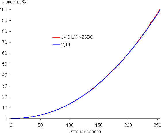 Реальная гамма-кривая лучше всего аппроксимируется степенной функцией с показателем 2,14, что чуть-чуть ниже стандартного значения 2,2, при этом реальная гамма-кривая мало отклоняется от степенной зависимости: