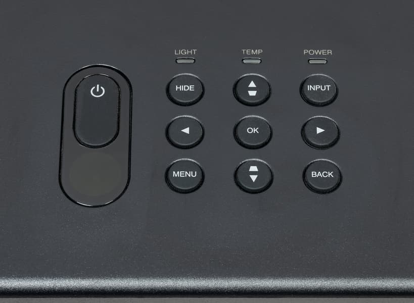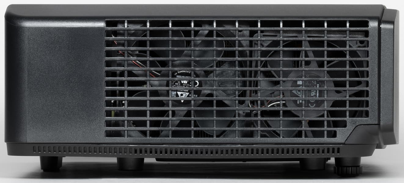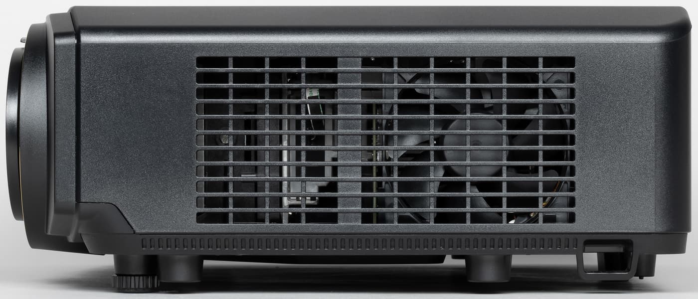 На вертикальную плоскость этой ниши наклеен лист прочного пластика — металлические края разъемов видимых царапин на нем не оставляют, — правда его нет около разъемов HDMI. Подписи к разъемам хорошо читаемые только при прямом отражении света. Также на задней панели можно обнаружить разъем питания и разъем для кенсингтонского замка. Основная заборная решетка вентиляции находится на левом боку. Фильтра от пыли в проекторе нет, что, впрочем, типично для современных DLP-проекторов.
