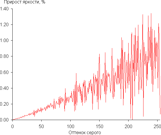 Реальная гамма-кривая зависимости от значения настройки Выберите гамму. Числовые значения этой настройки близки к показателям аппроксимирующей степенной функции. График ниже показывает прирост (не абсолютное значение!) яркости между соседними полутонами, полученный при последовательном выводе 256 оттенков серого (от 0, 0, 0 до 255, 255, 255) в случае Выберите гамму = 2.2: