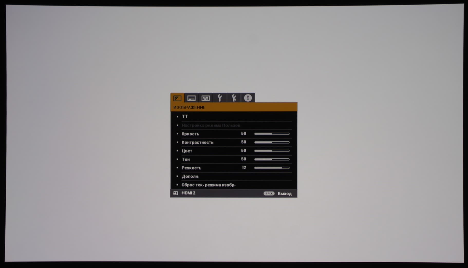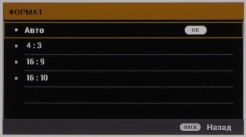 Для облегчения настройки проекции можно кнопкой пульта или из меню вывести на экран тестовый шаблон. Есть несколько режимов трансформации — достаточно, чтобы привести в соответствие формат области проекции и распространенные форматы видео.