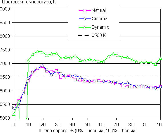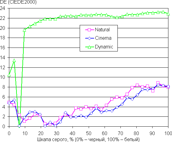 Графики ниже показывают цветовую температуру на различных участках шкалы серого и отклонение от спектра абсолютно черного тела (параметр ΔE) для самого яркого режима (выбран профиль Dynamic) и для профилей Natural и Cinema. Укажем, что близкий к черному диапазон можно не учитывать, так как в нем цветопередача не так важна, а погрешность измерения цветовых характеристик высокая.