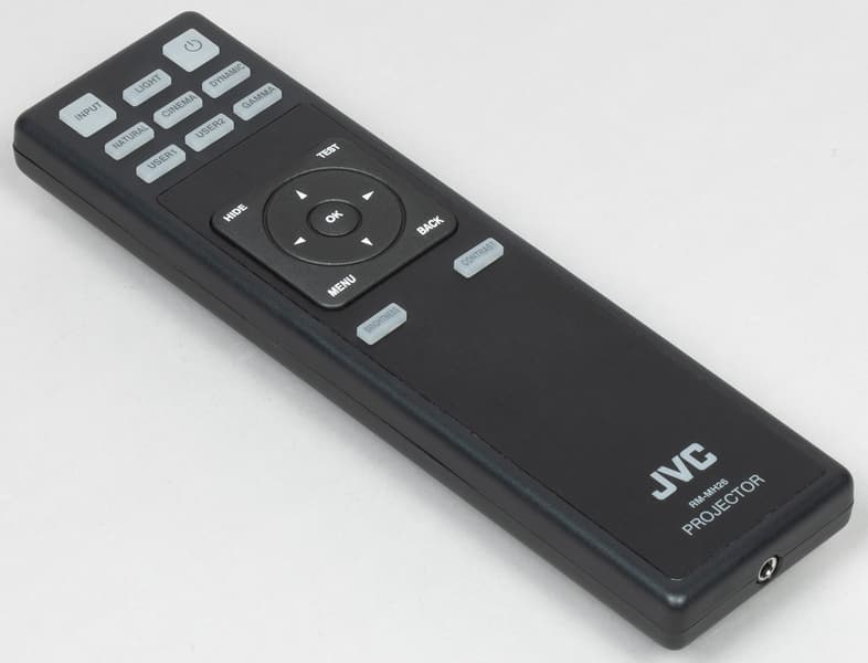 Корпус ИК-пульта дистанционного управления изготовлен из пластика снаружи с черной матовой поверхностью. Сверху наклеена пластина из прочного пластика с фактурной поверхностью. Пульт толстоват, поэтому в руке лежит не очень удобно. Кнопки не очень мелкие (они из резиноподобного материала), подписи относительно читаемые. Кнопок немного. Ход кнопок недлинный, при срабатывании кнопок раздается выраженный щелчок. В заднем торце пульта есть гнездо миниджек 3,5 мм, которое обычно используется для проводного подключения пульта к проектору, но в данном случае на проекторе нет ответного разъема. Есть достаточно яркая синяя светодиодная подсветка, включающаяся при нажатии только на кнопку подсветки (Light), что неудобно, к тому же эта кнопка в темноте не фосфоресцирует, как это бывает. Выключается подсветка через 10 секунд после последнего отпускания кнопки пульта. Питается пульт от двух элементов питания AA, которые включены в комплект поставки.