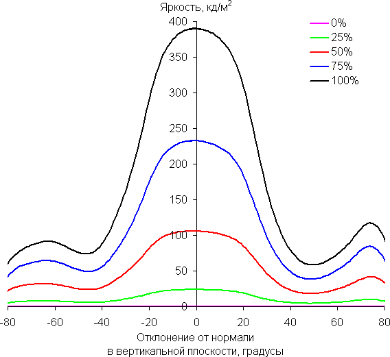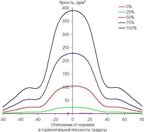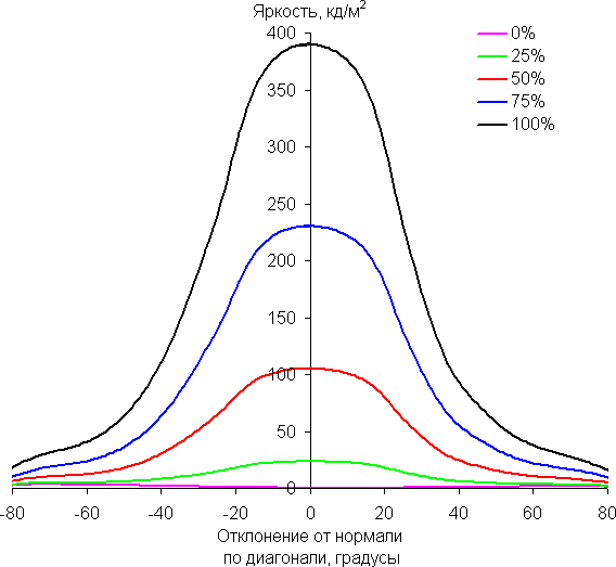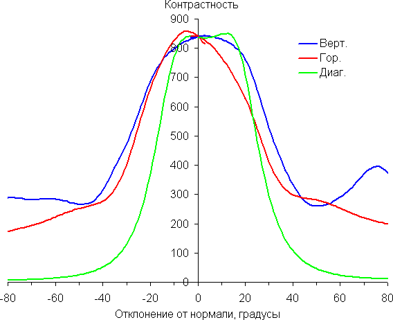 По скорости снижения яркости углы обзора не очень широкие. При отклонении в диагональном направлении яркость черного поля начинает резко возрастать уже при 20°-30° отклонения от перпендикуляра к экрану. Если сидеть недалеко от экрана, то черное поле по углам будет заметно светлее, чем в центре, но оставаясь при этом условно нейтрально-серым. Контрастность в диапазоне углов ±82° в случае отклонения по диагонали приближается к отметке 10:1 и по одной диагонали опускается ниже при 68°.