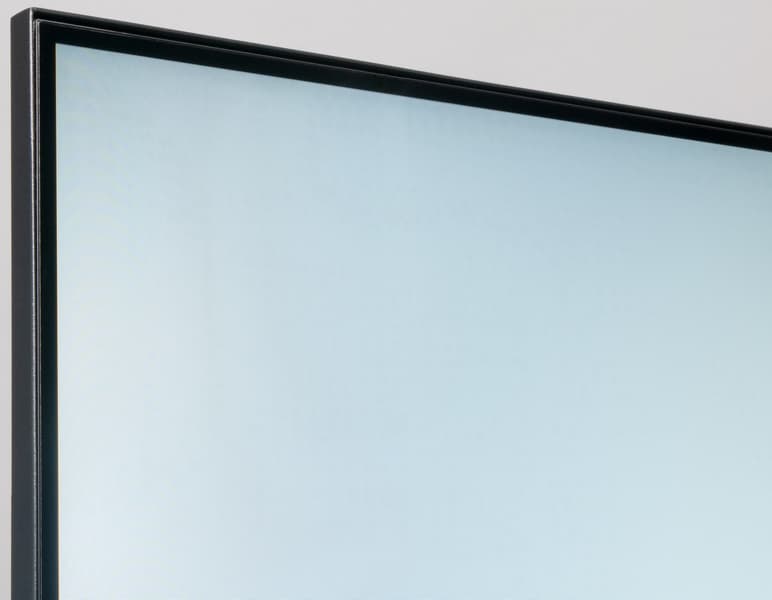 Дизайн строгий, декоративные элементы отсутствуют. Экран визуально безрамочный, он выглядит как монолитная поверхность, ограниченная снизу узкой планкой, а сверху и с боков — узкой окантовкой. Планка снизу изготовлена из алюминиевого сплава, ее матовая поверхность анодирована и окрашена в черный цвет. На самом деле планка представляет собой уголок, который частично прикрывает нижний торец. Выведя изображение на экран, можно увидеть, что на самом деле между внешними границами экрана и собственно областью отображения есть неширокие поля (от области отображения до внешних границ экрана сверху и с боков по 9 мм, а снизу — 19 мм).