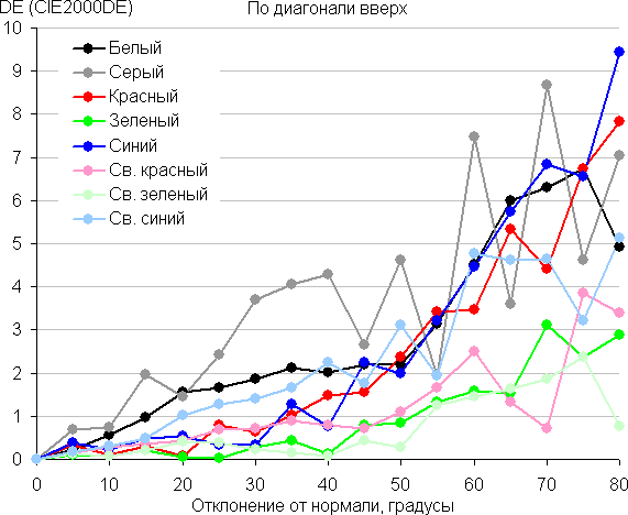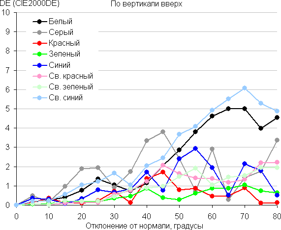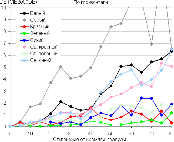 Для количественной характеристики изменения цветопередачи мы провели колориметрические измерения для белого, серого (127, 127, 127), красного, зеленого и синего, а также светло-красного, светло-зеленого и светло-синего полей во весь экран с использованием установки, подобной той, что применялась в предыдущем тесте. Измерения проводились в диапазоне углов от 0° (датчик направлен перпендикулярно к экрану) до 80° с шагом в 5°. Полученные значения интенсивностей были пересчитаны в отклонение ΔE относительно замера каждого поля при перпендикулярном положении датчика относительно экрана. Результаты представлены ниже: