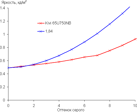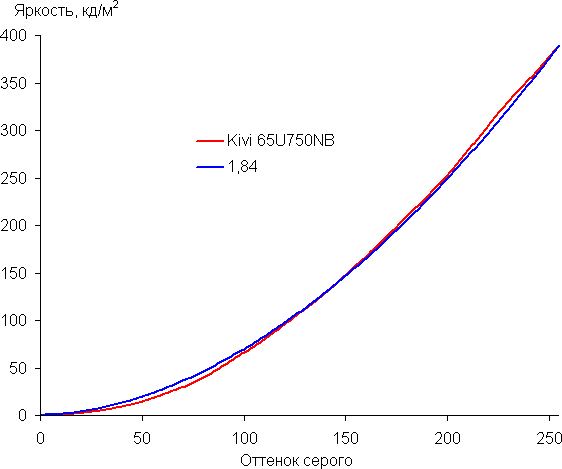 Аппроксимация полученной гамма-кривой дала показатель 1,84, что ниже стандартного значения 2,2. При этом реальная гамма-кривая немного отклоняется от аппроксимирующей степенной функции и имеет слегка выраженный S-образный вид: