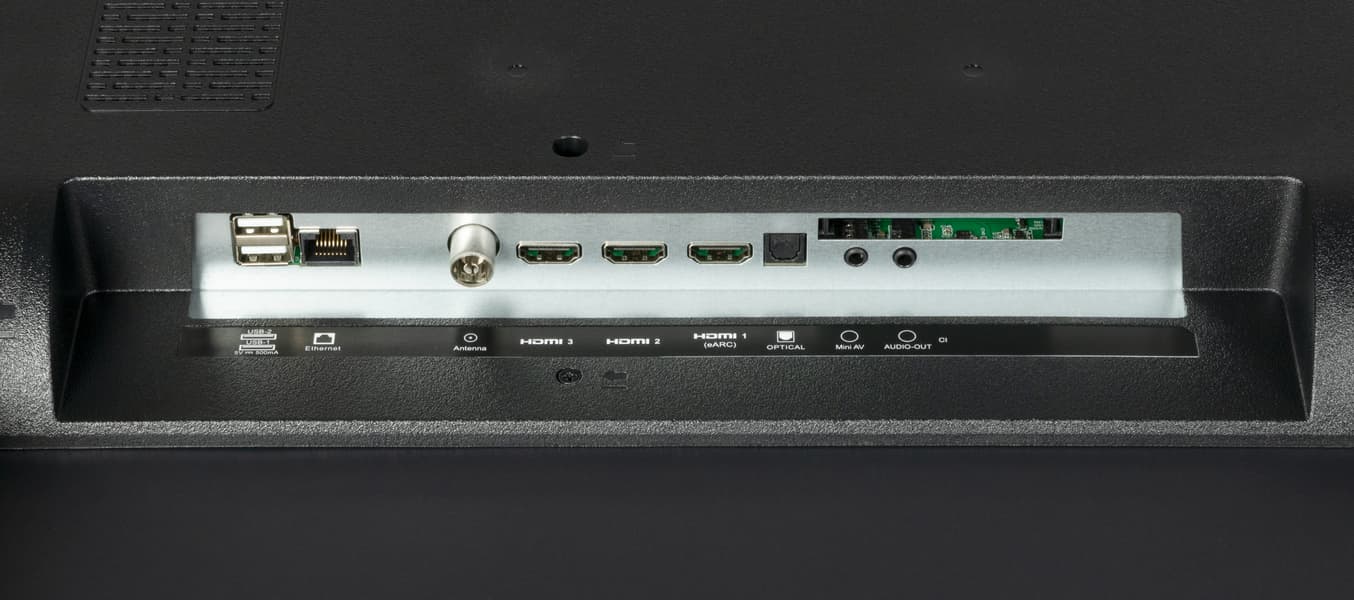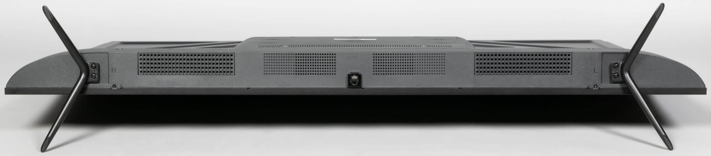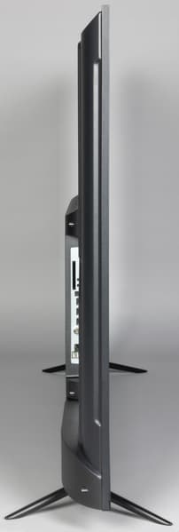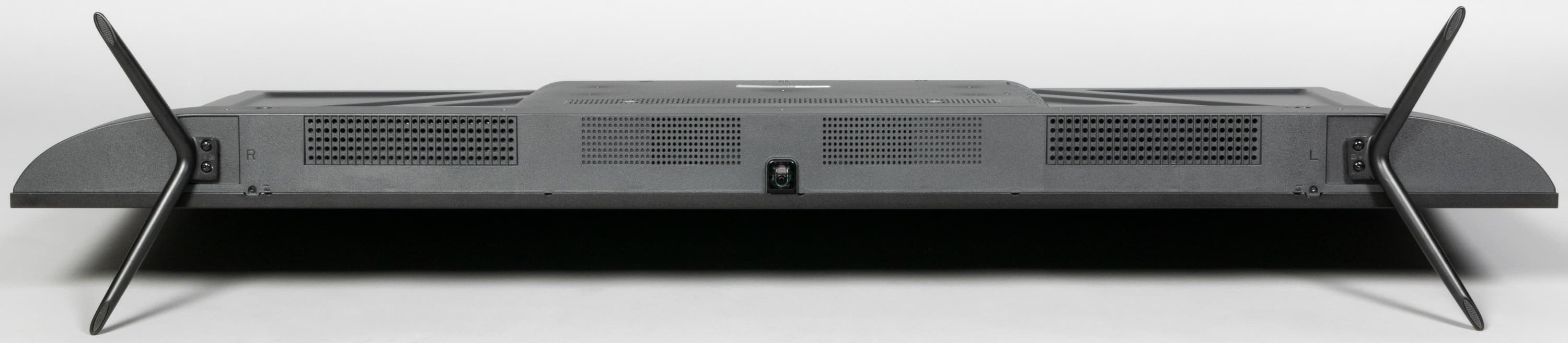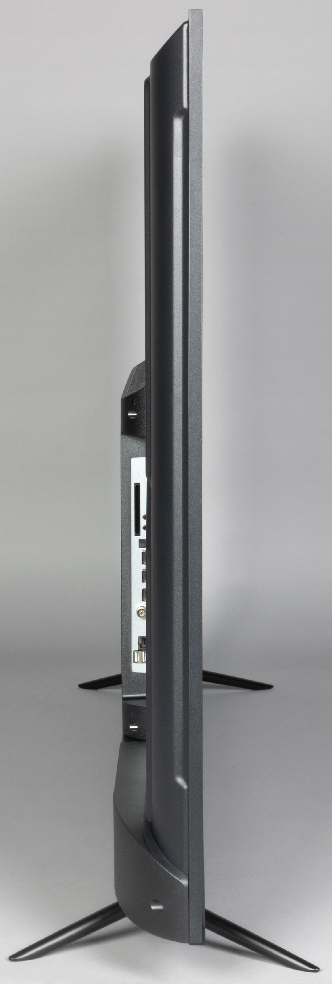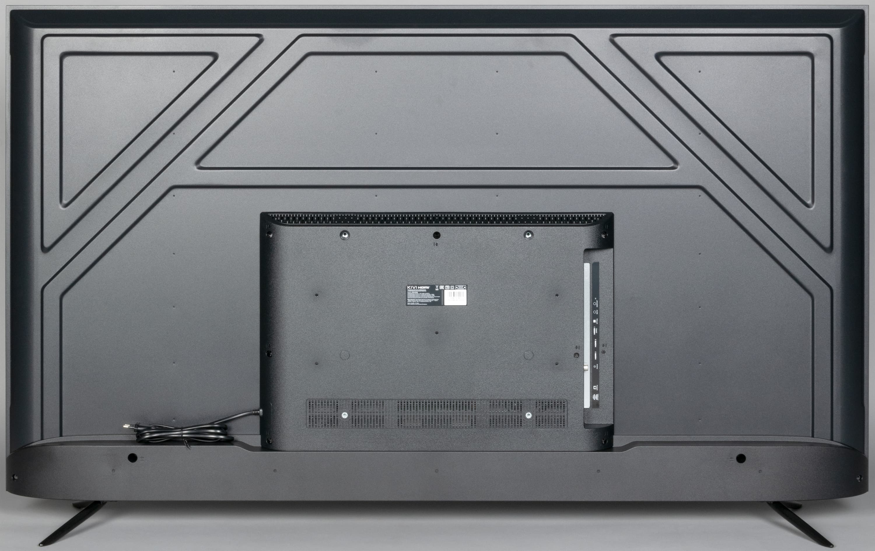 Задняя панель в верхней части изготовлена из тонкого листа стали и имеет стойкое черное матовое покрытие. Сверху и с боков панель заходит на торцы и образует окантовку экрана. Выступающий назад кожух в нижней части с заходом на нижний торец изготовлен из черного пластика с матовой поверхностью. Интерфейсные разъемы размещены в незамкнутой нише на кожухе сзади и направлены вбок. Спереди дотягиваться до разъемов неудобно, так как они расположены далеко от края. В верхней части телевизор нетонкий.