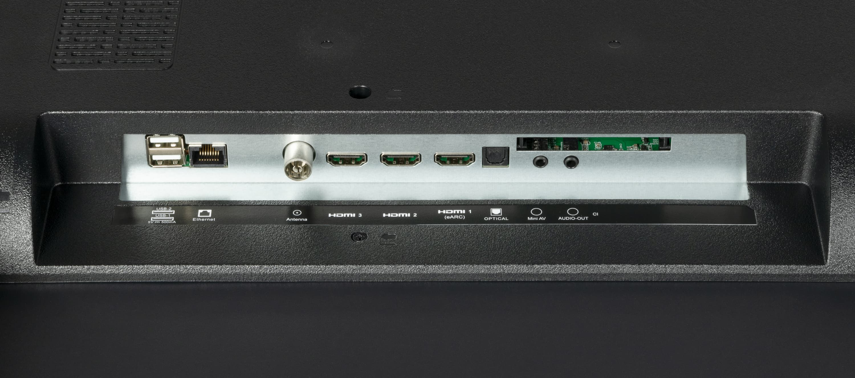 Таблица с характеристиками в начале статьи дает представление о коммуникационных возможностях телевизора. Большинство разъемов полноразмерные и размещены более-менее свободно. Исключениями являются сдвоенные порты USB — две пухлые флешки без использования удлинителя в них уже не вставишь, — а также разъем для ввода композитного видеосигнала и стереозвука в аналоговом виде, который представляет собой гнездо для четырехконтактного миниджека. Впрочем, производитель не забыл приложить к телевизору соответствующий переходники на три RCA.