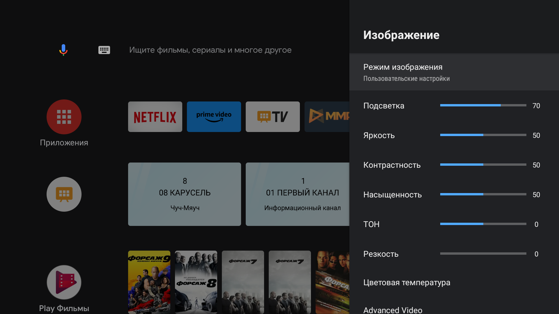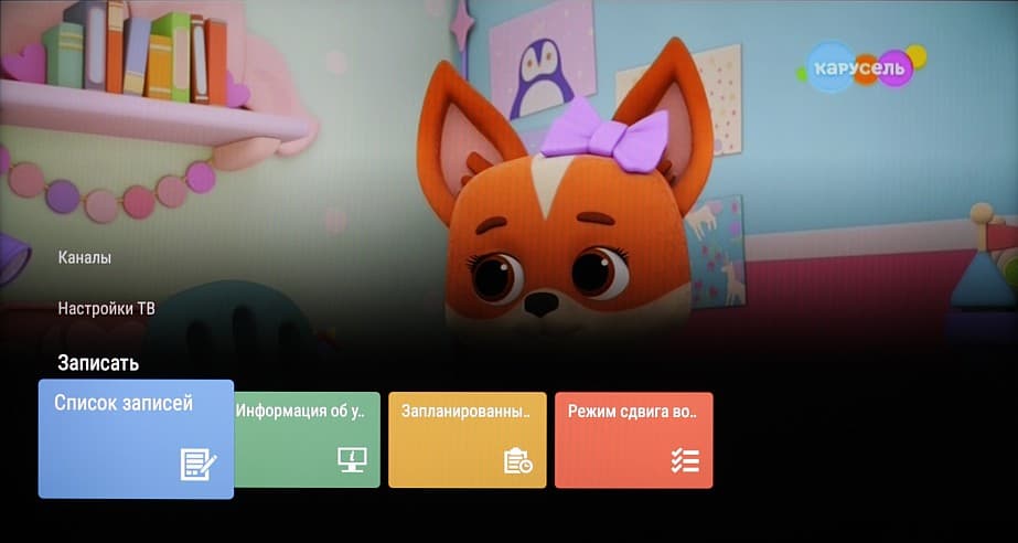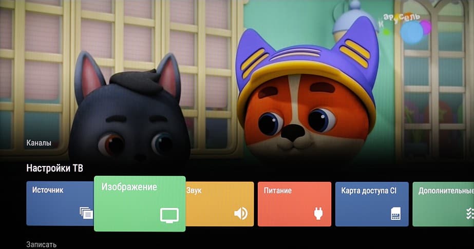 Доступ к настройкам также удобно получить из контекстного меню с плитками, которое можно вывести на экран при просмотре ТВ-каналов или внешних источников видеосигнала.