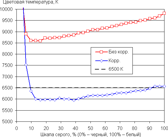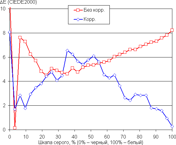 Графики ниже показывают цветовую температуру на различных участках шкалы серого и отклонение от спектра абсолютно черного тела (параметр ΔE) для профиля Пользовательские настройки без коррекции и после ручной коррекции (настройки усиления для красного, зеленого и синего цветов — 0/−39/−59):