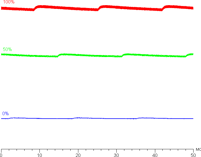На любом уровне яркости значимая модуляция подсветки отсутствует, поэтому нет и никакого мерцания экрана. Для тех, кто привык распознавать знакомое сокращение, уточним: ШИМ отсутствует. В доказательство приведем графики зависимости яркости (вертикальная ось) от времени (горизонтальная ось) при различных значениях настройки Подсветка: