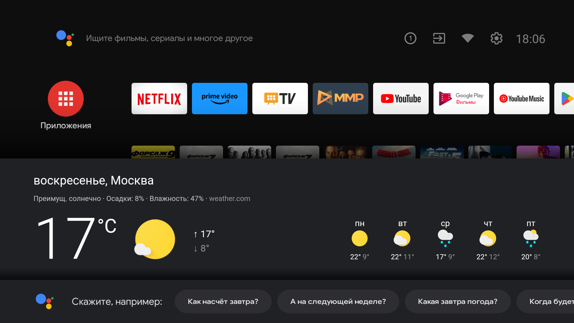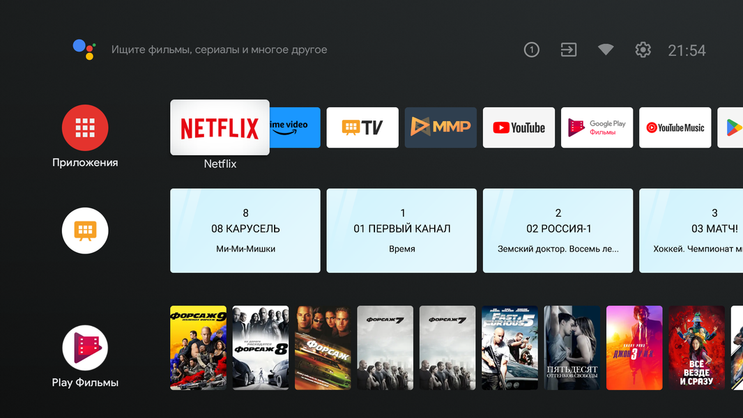Домашняя страница (или Главный экран) в Android TV представляет собой несколько горизонтальных лент с плитками избранных установленных приложений и рекомендуемого контента. Кружки с подписями слева поясняют, к чему относятся содержимое лент, и позволяют запустить соответствующую программу (или выводят список установленных программ — кружок Приложения). В верхней части страницы есть значки-кнопки голосового и текстового ввода строки поиска, вывода системных сообщения, выбора входов, индикации подключения к сети, доступа к настройкам и часы.