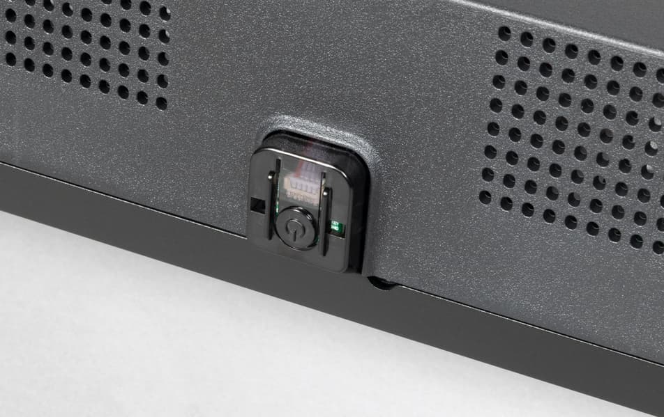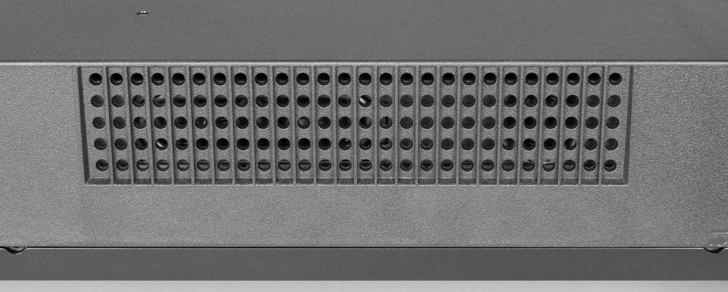 На пластиковом кожухе сверху, сзади и снизу есть вентиляционные решетки. За двумя решетками на нижнем торце можно разглядеть по паре громкоговорителей — среднечастотный с вытянутым диффузором и высокочастотный с круглым.