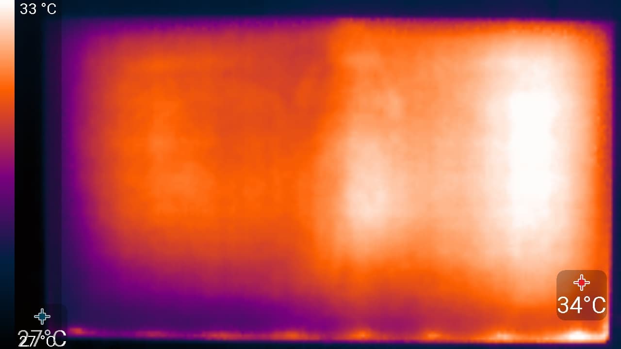 Нагрев телевизора можно оценить по приведенному снимку с ИК-камеры, полученному после долговременной работы на максимальной яркости в помещении с температурой примерно 24 °C: